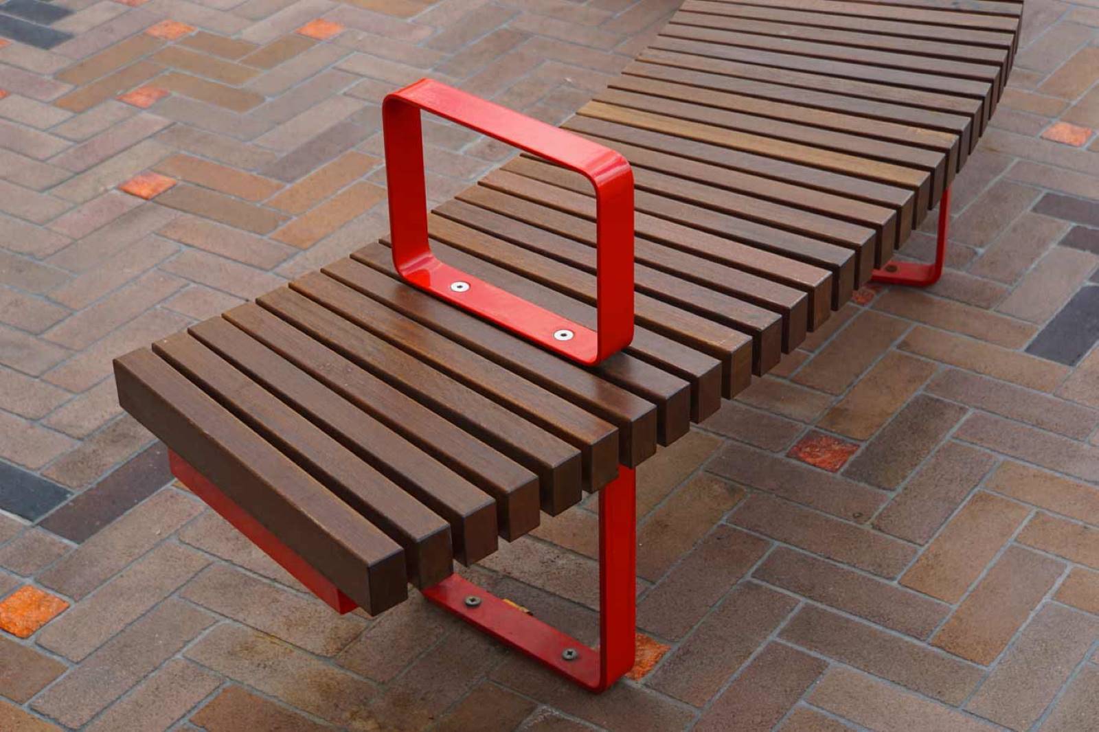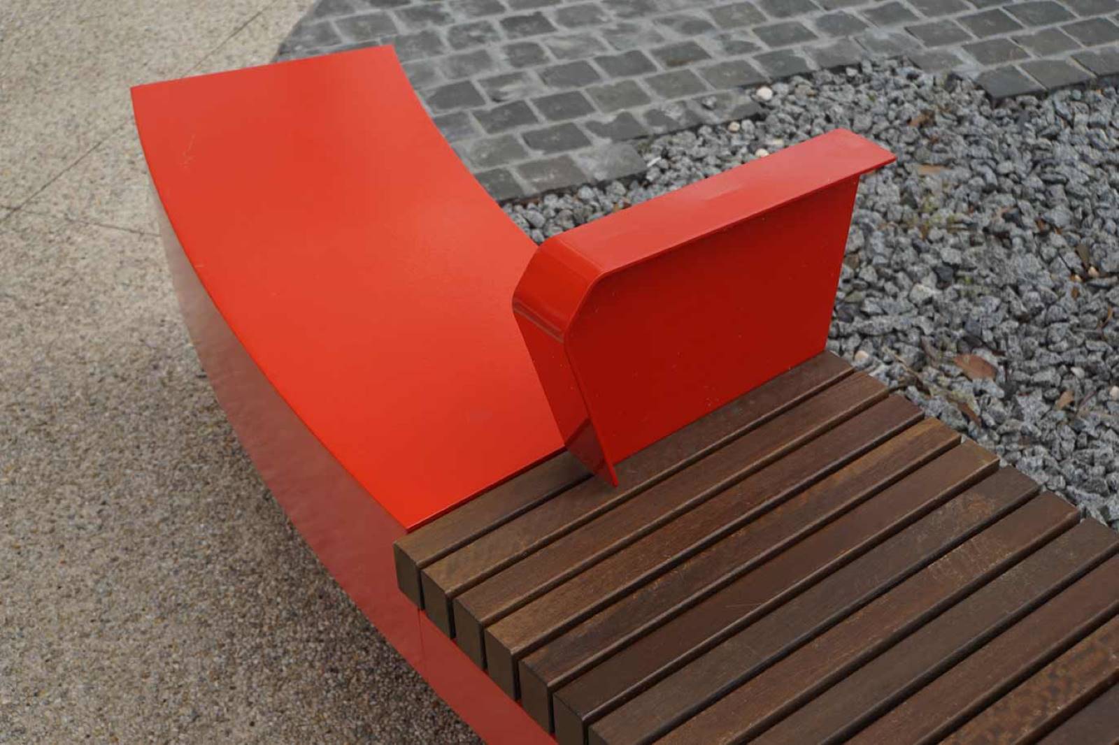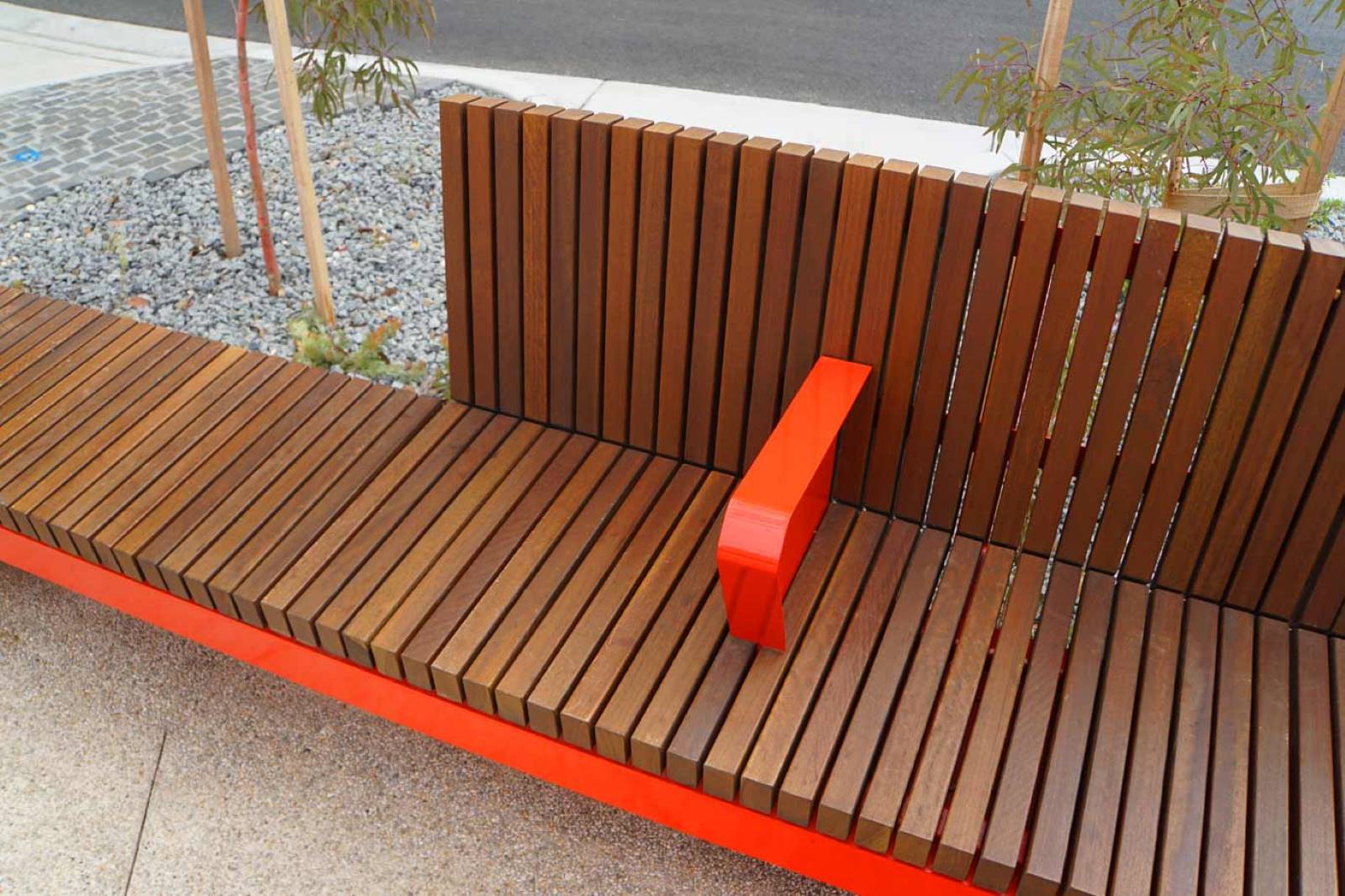 Mild steel frames, hot dipped galvanised and 2-Pack Painted Signal Red. Stand-alone furniture has mild steel frames with a powder coated finish. All timber battens are Australian Spotted gum.
