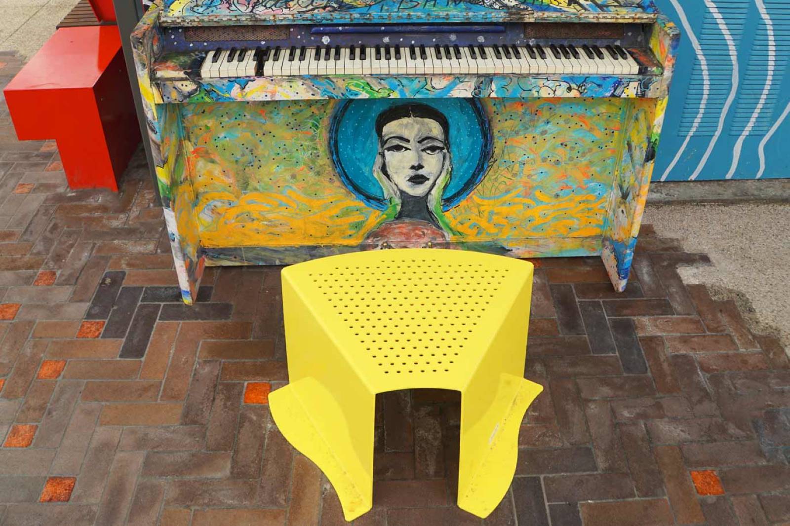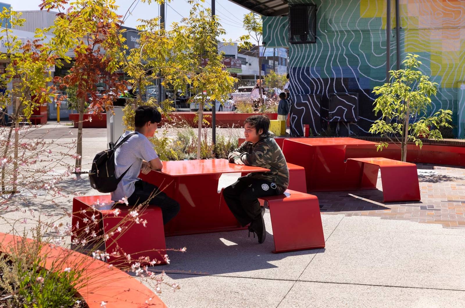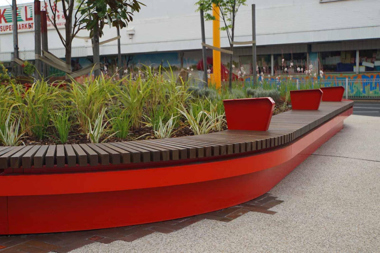 Mild steel frames, hot dipped galvanised and 2-Pack Painted Signal Red. Stand-alone furniture has mild steel frames with a powder coated finish. All timber battens are Australian Spotted gum.