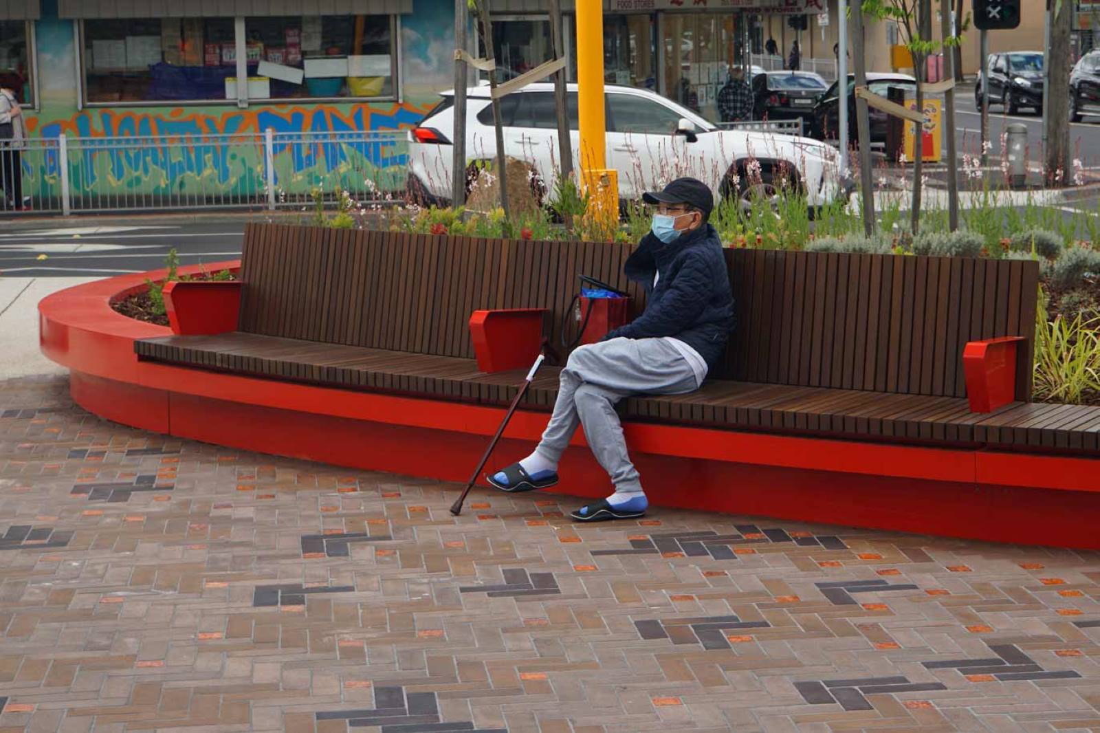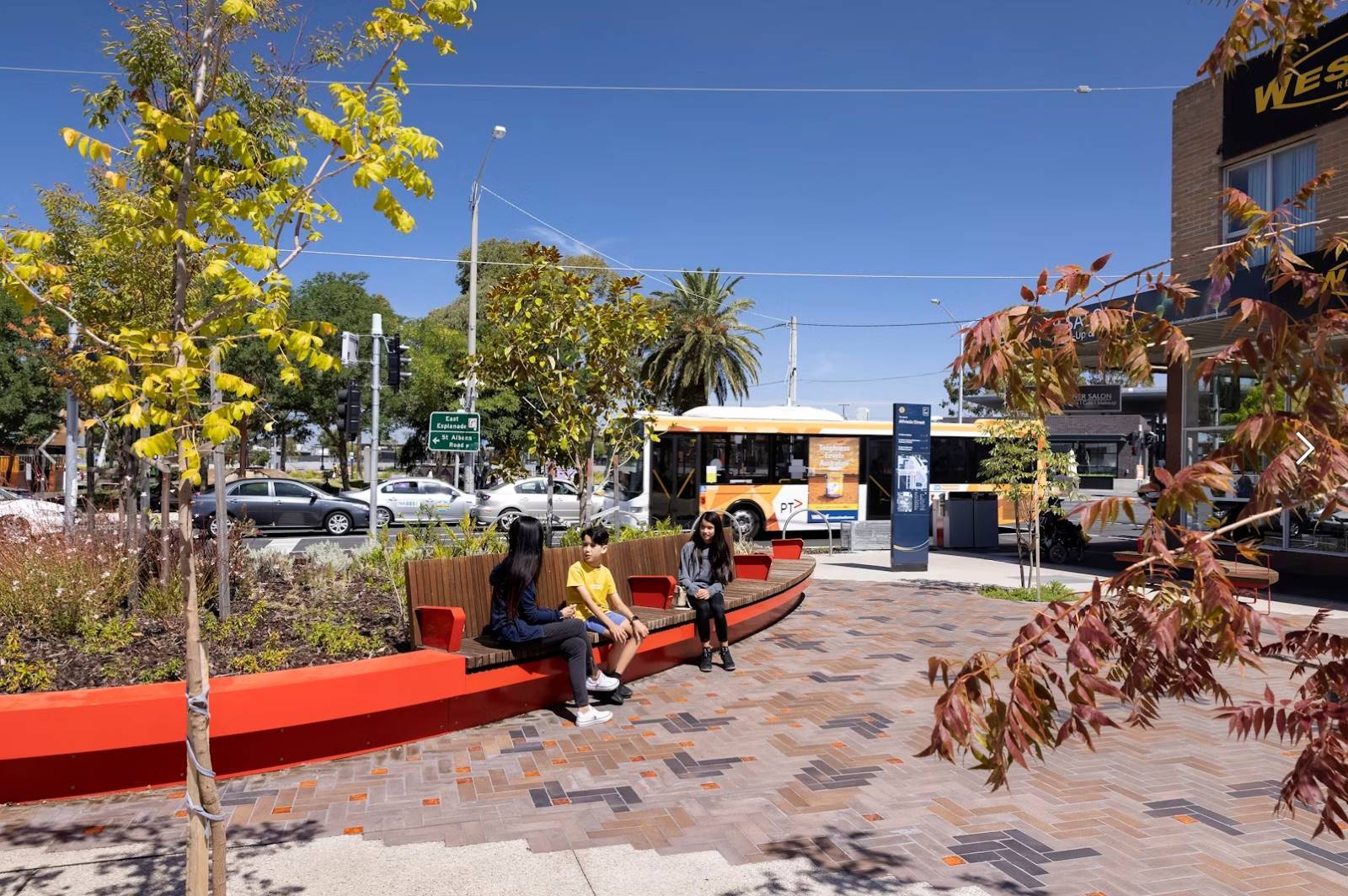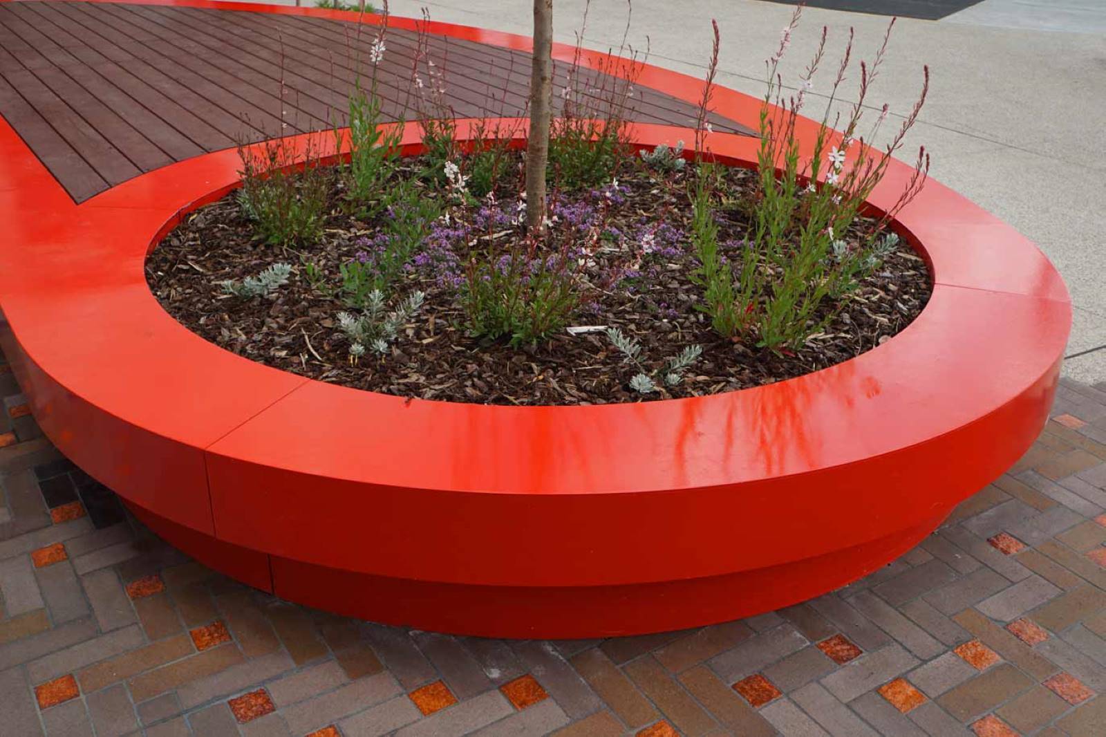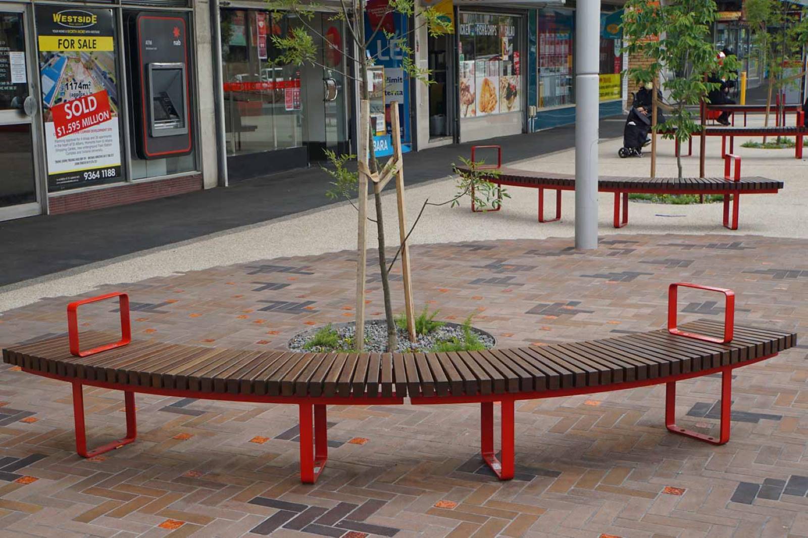 Suite of custom furniture designs developed for the entrance of Alfrieda Street in St Albans. The custom architect designed curved benches and planters creating a vibrant and eye-catching communal space.