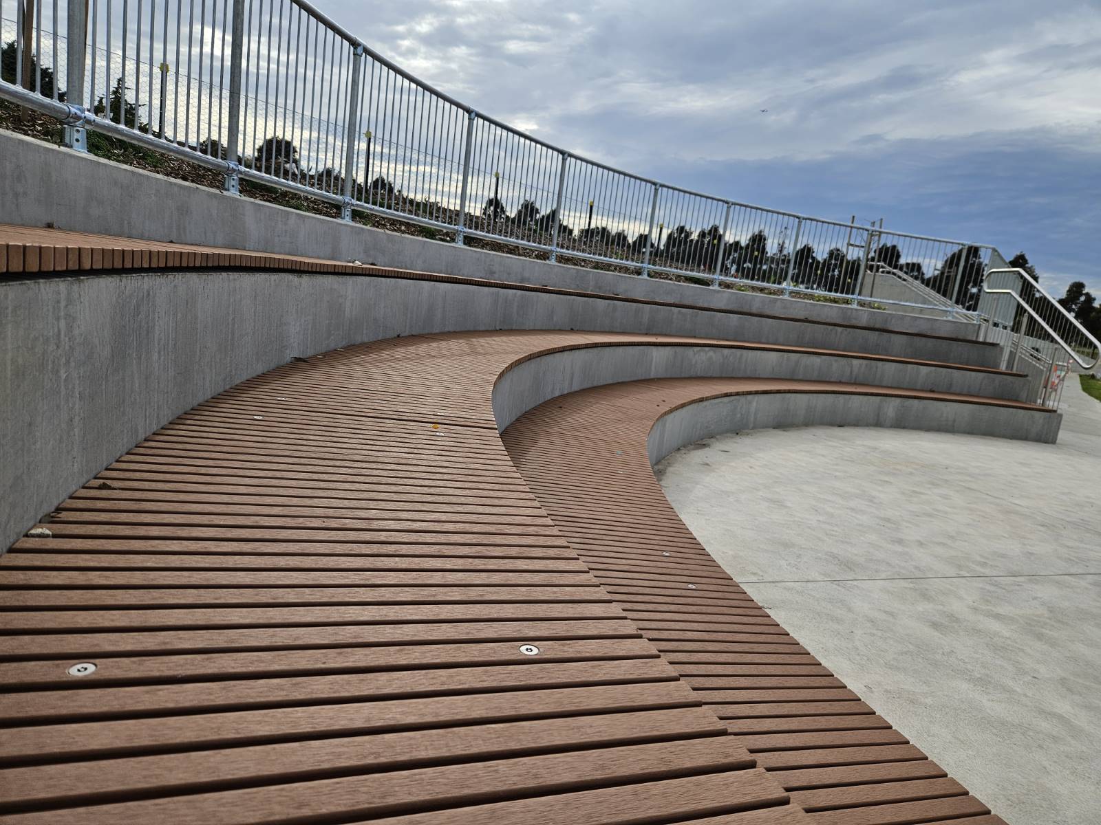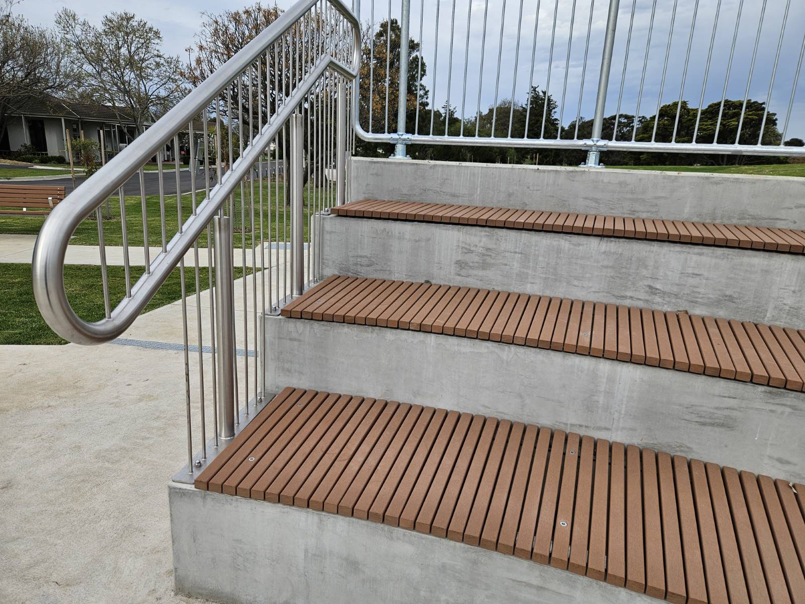 Design and manufacture extensive wall mounted curved benches to sit on some very well constructed in-situ concrete walls by Extend Building. Benches supplied in modules that were then chemset into position, secured down with post torx security fixings.