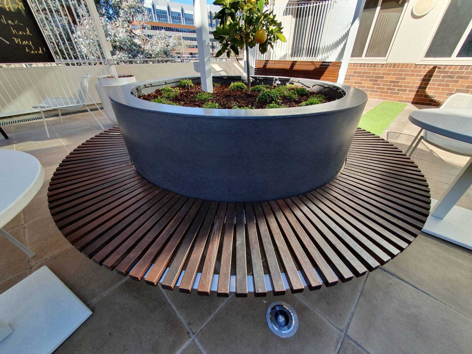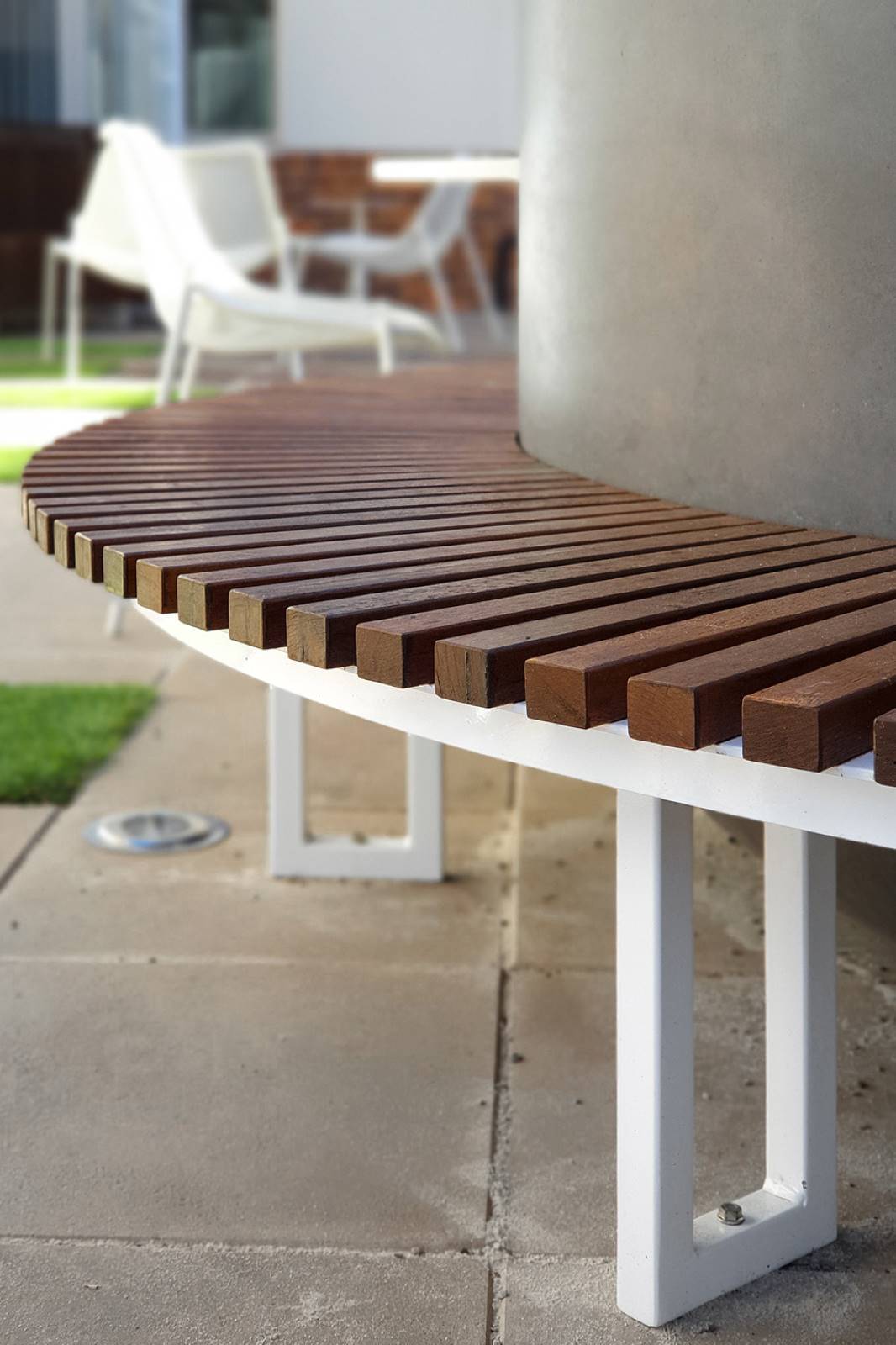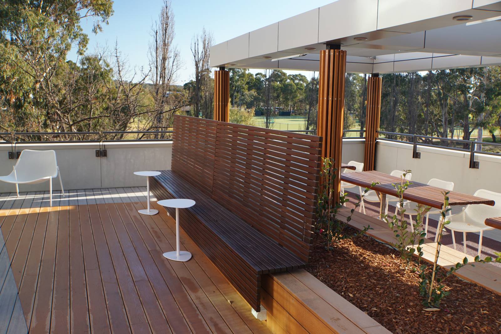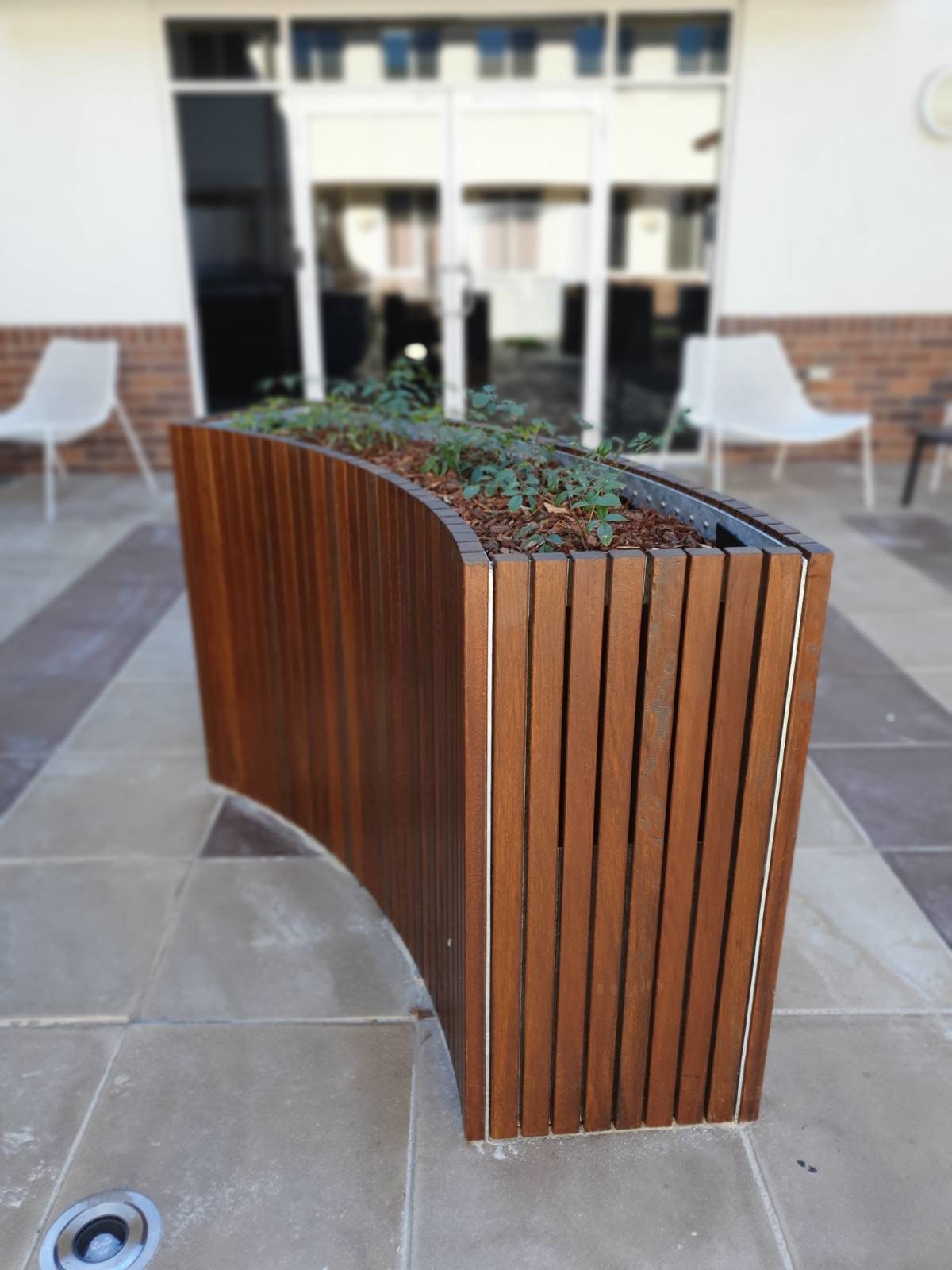 Timber pod seating, custom curved benches and curved planters are all combined be part of the courtyard upgrade at ANU in Canberra. This predominately timber installation utilises Australian Spotted Gum on a combination of frame materials to achieve the incorporated effect.