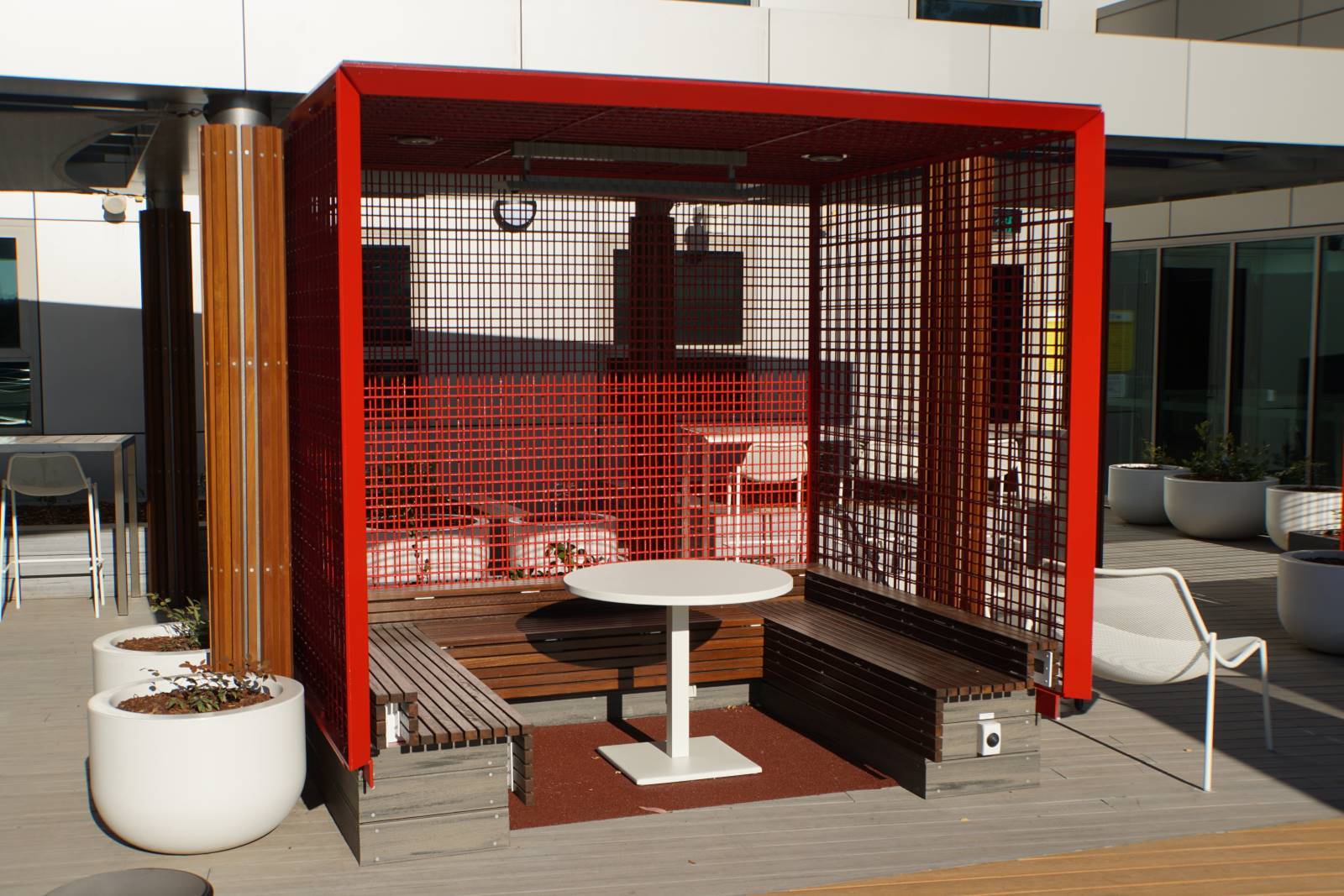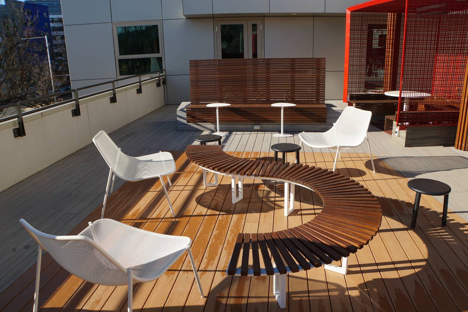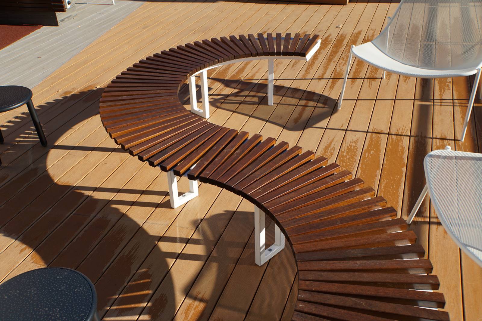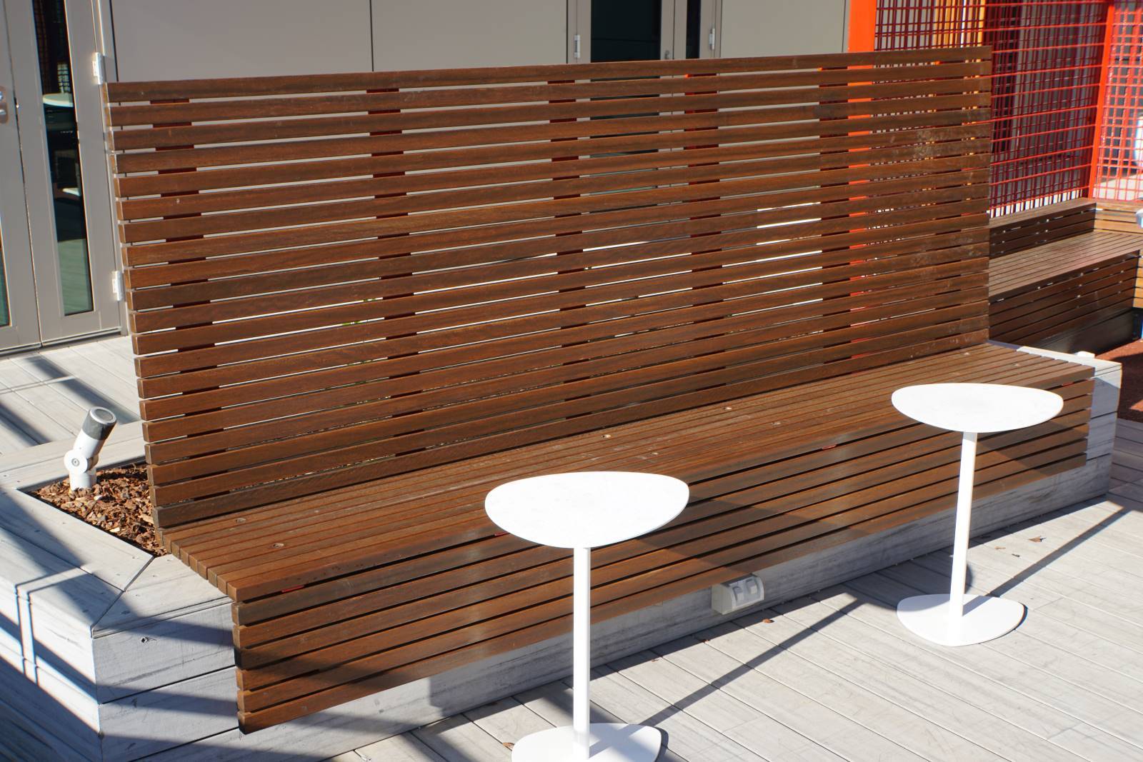 Timber pod seating, custom curved benches and curved planters are all combined be part of the courtyard upgrade at ANU in Canberra. This predominately timber installation utilises Australian Spotted Gum on a combination of frame materials to achieve the incorporated effect.
