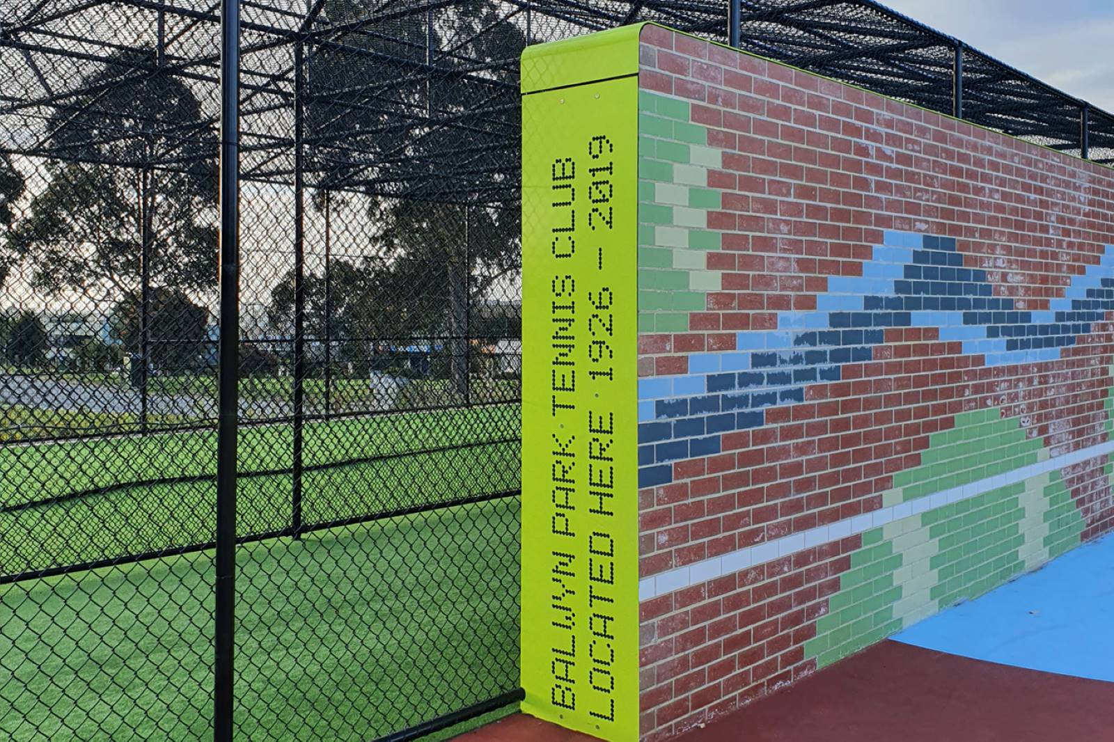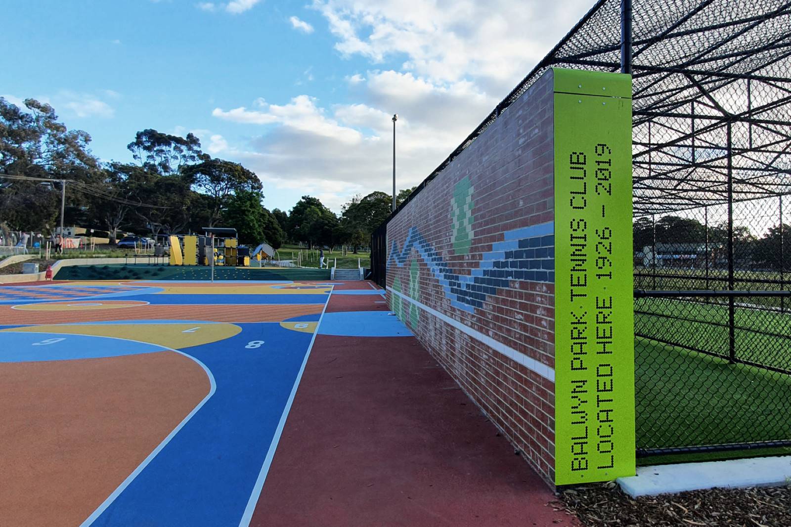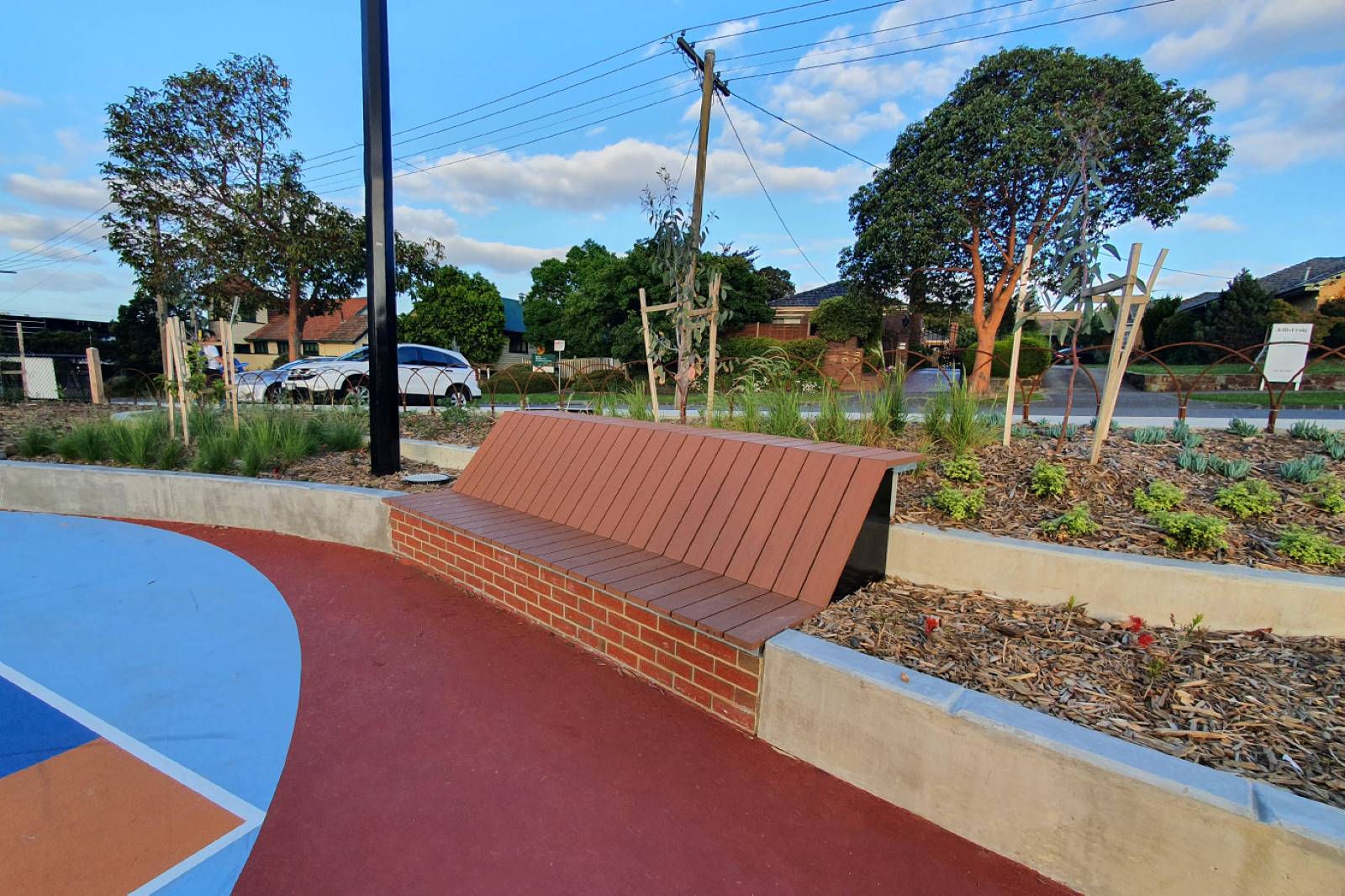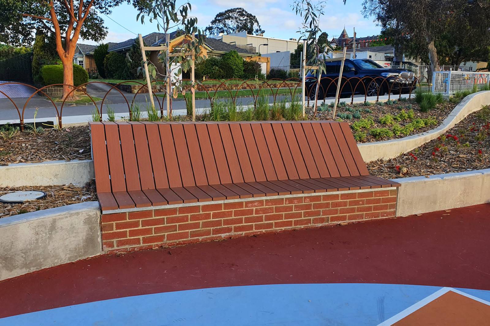 Measurement, Design & Construction of curved wall seating around the Balwyn Park redevelopment and the brick hit up wall side cladding with perforated park information.