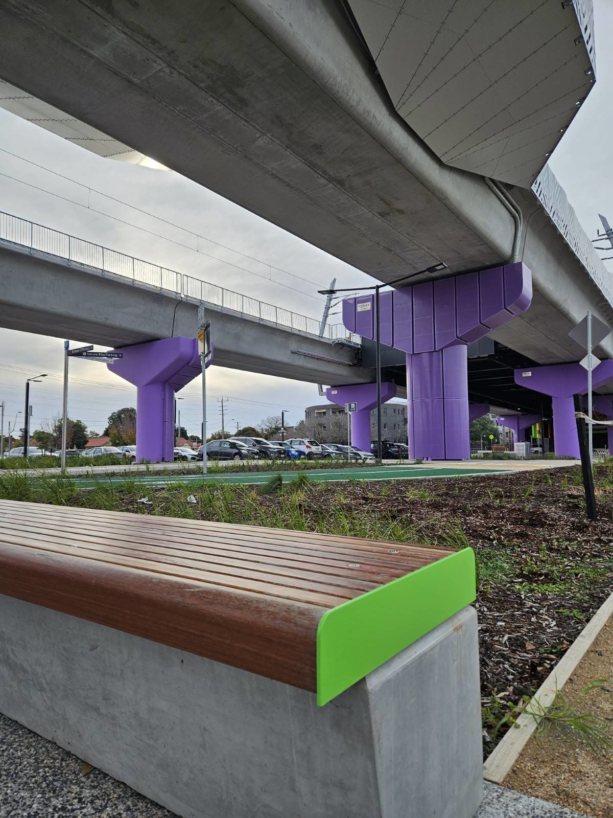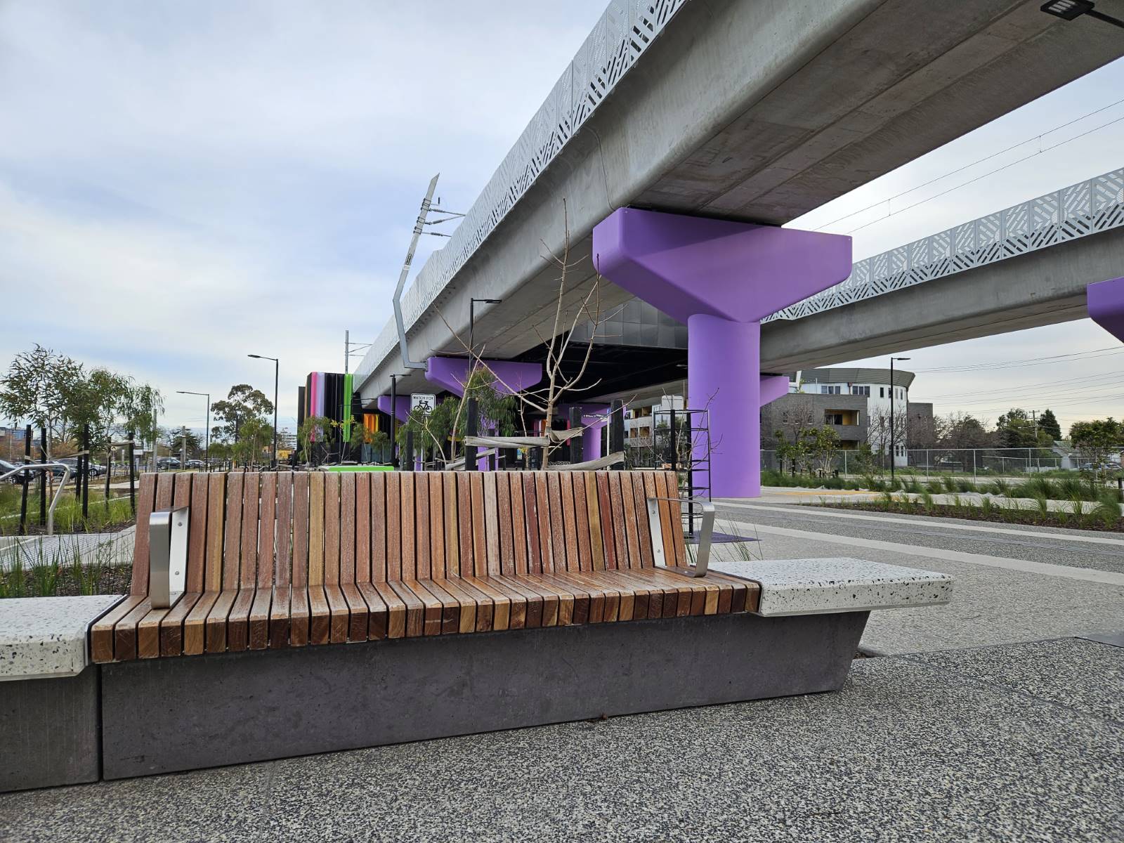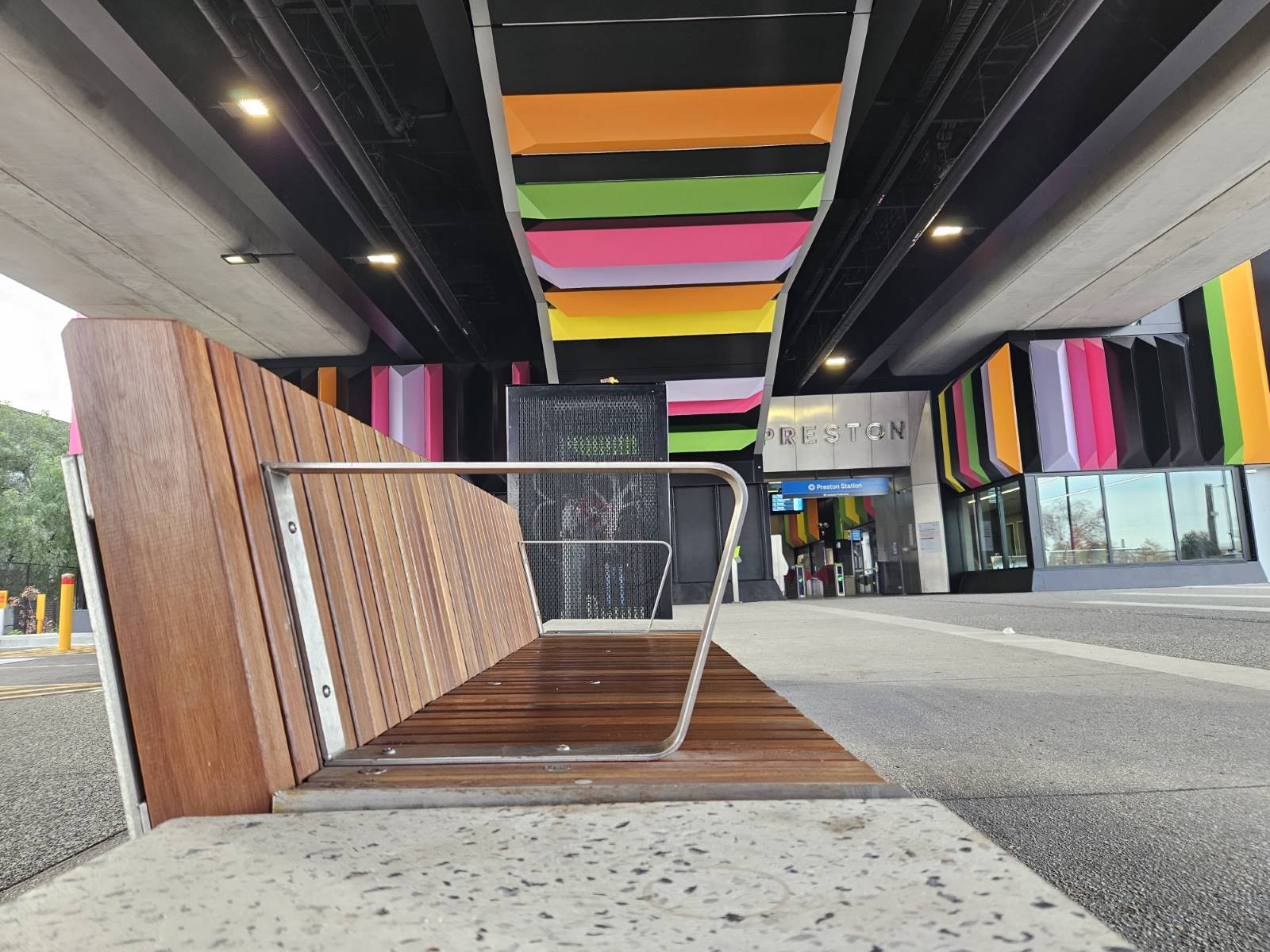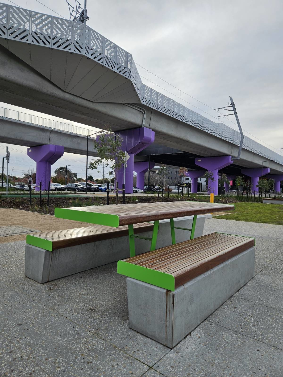 Supply of a complete suite of furniture items for the level crossing removal program. For the Bell & Preston stations, CSA supplied wall mounted seating. bench and table sets, bike racks, tree guards and grates with the station platform seating.