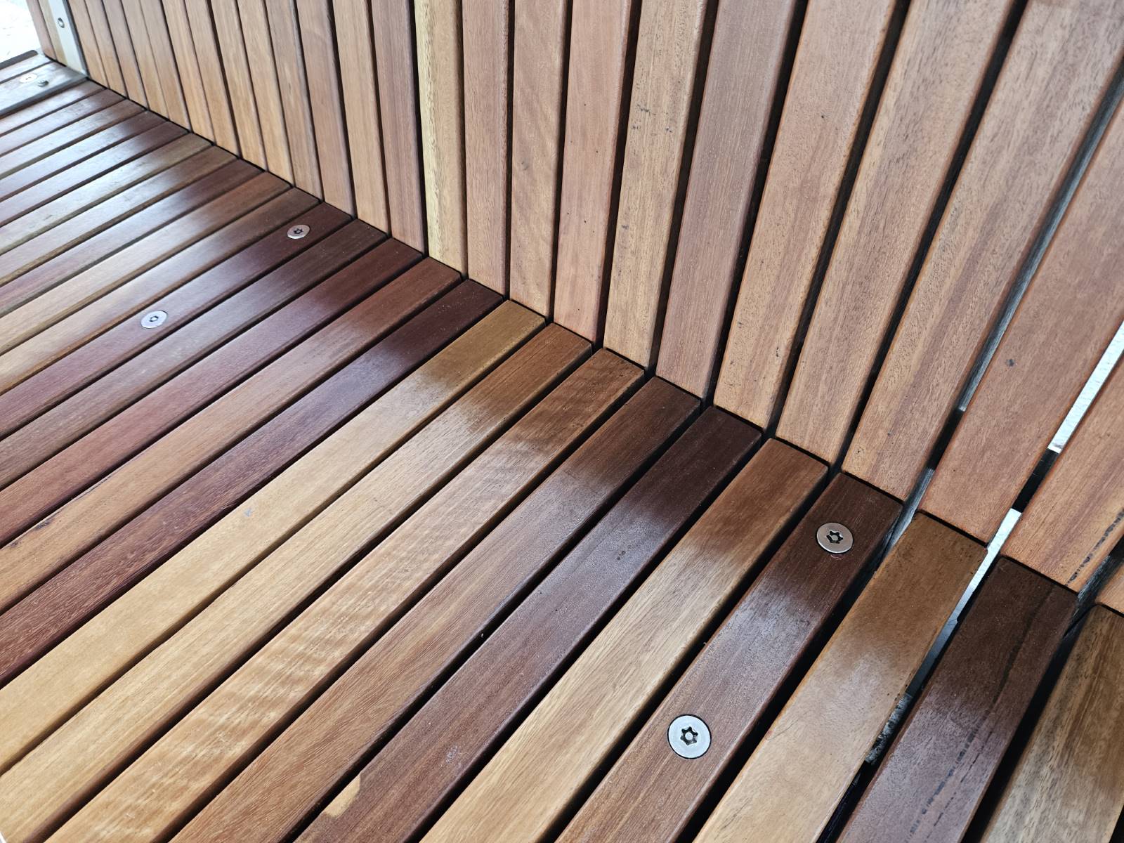 Combination of mild steel and stainless steel furniture. The mild steel furniture was galvanised and painted a vibrant green. The furniture includes Australian Spotted Gum timber battens.