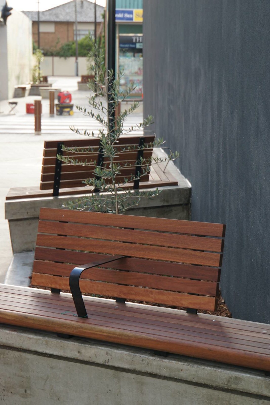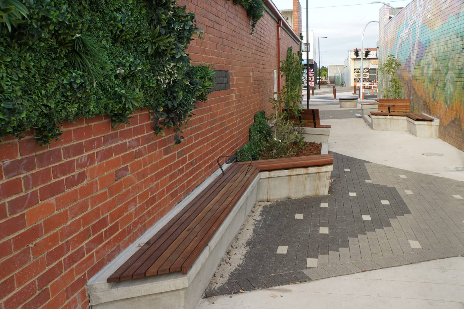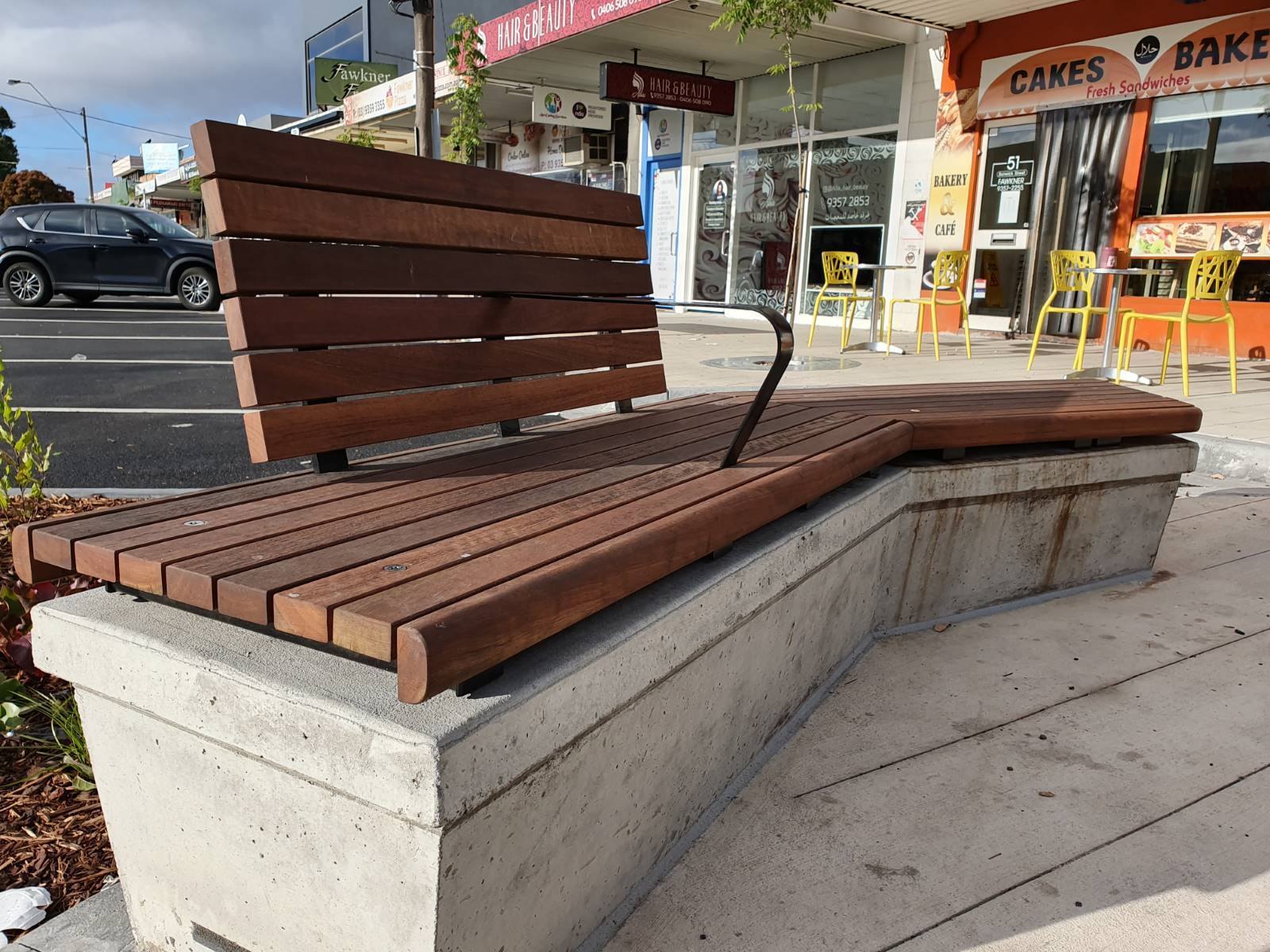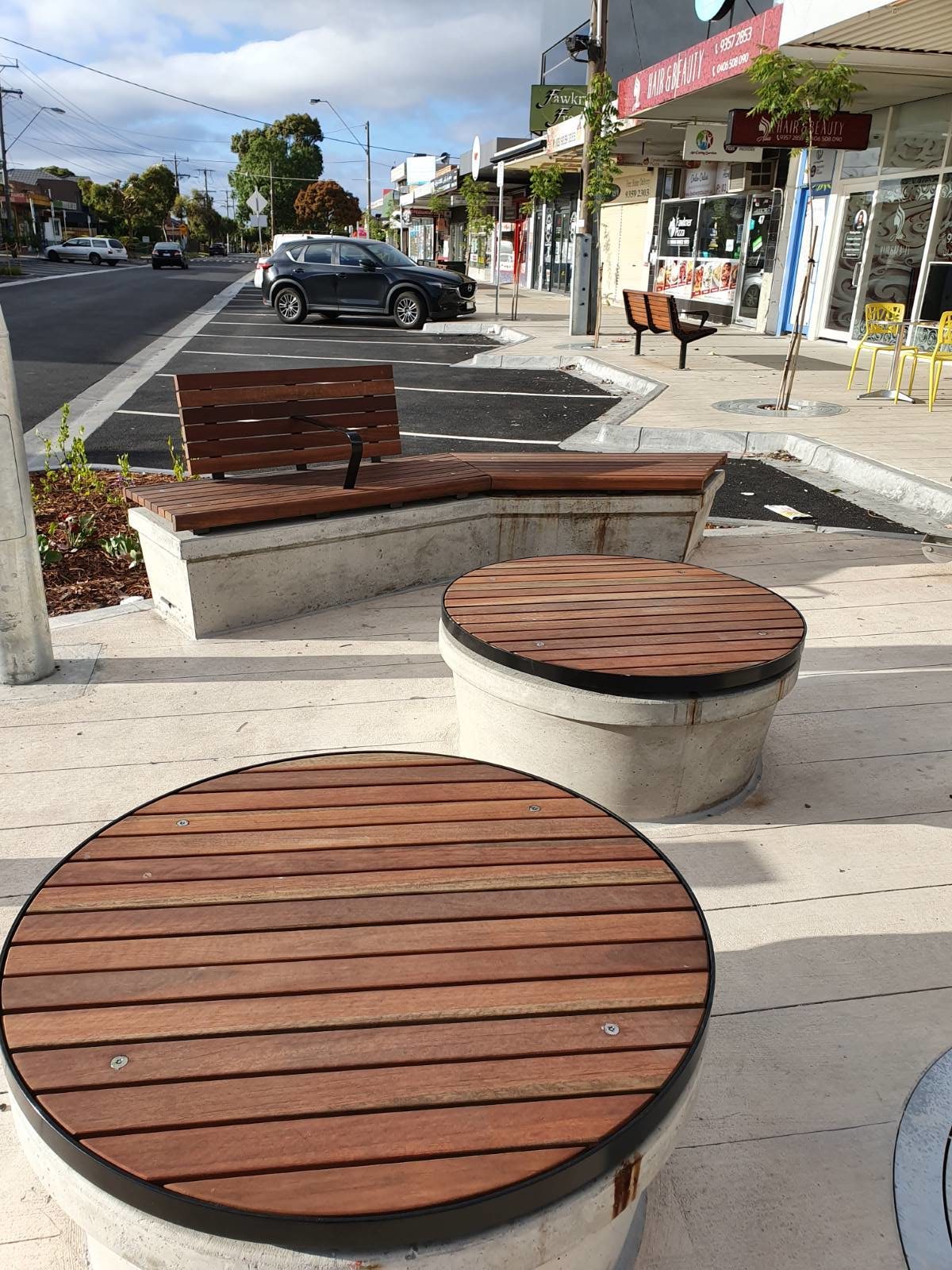 Custom suite of furniture for the upgrade of Bonwick Street shops in Fawkner. Wall mounted benches and seats, all measured and mitred to in-situ cast concrete walls. Circular wall top ottomans were also placed around the streetscape. Unique stainless steel and timber bollards were also utilised around the main intersection.
