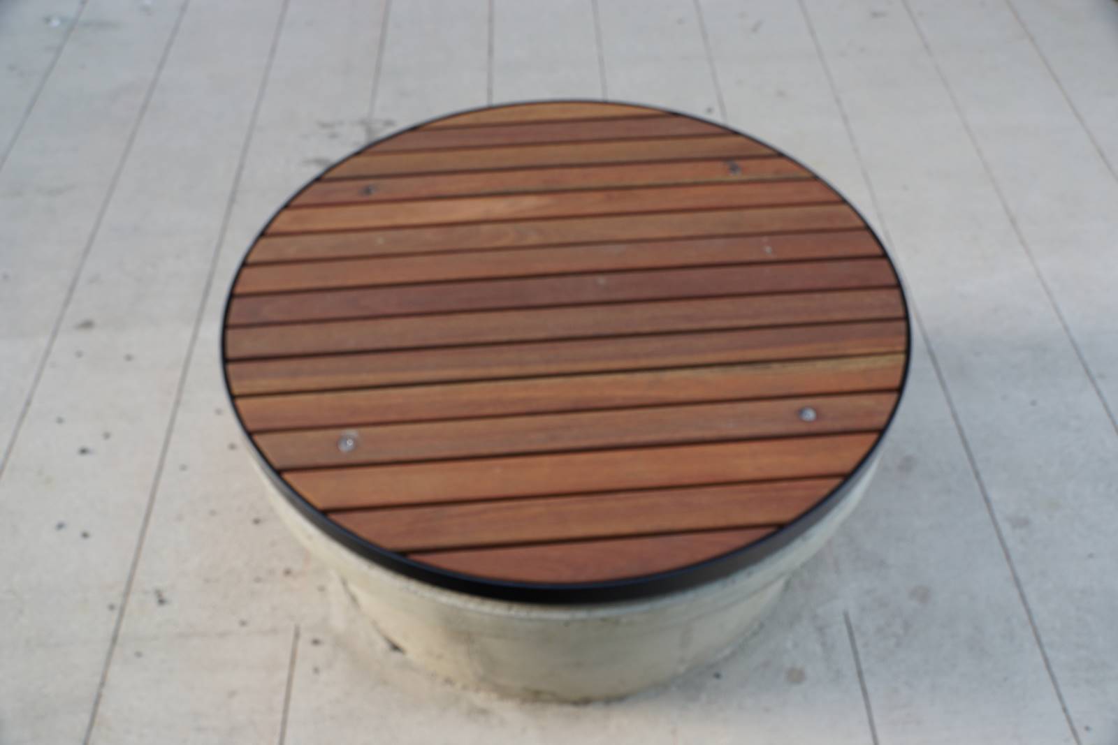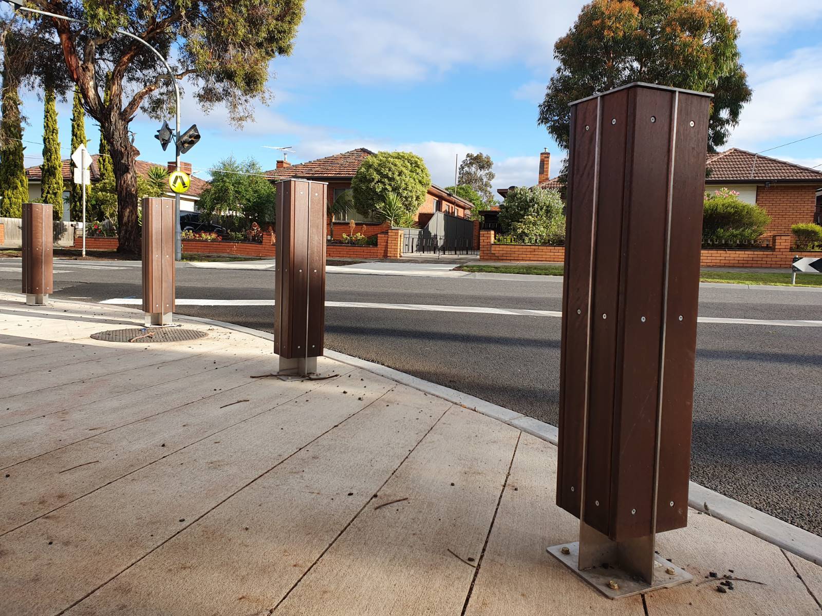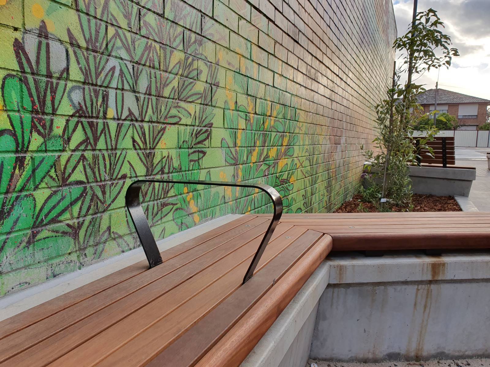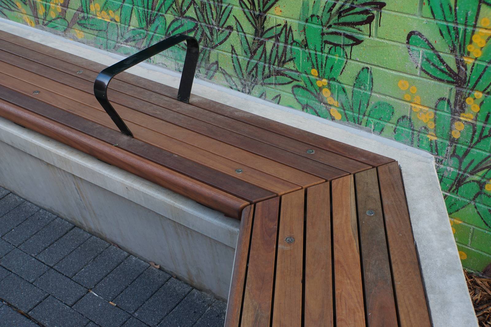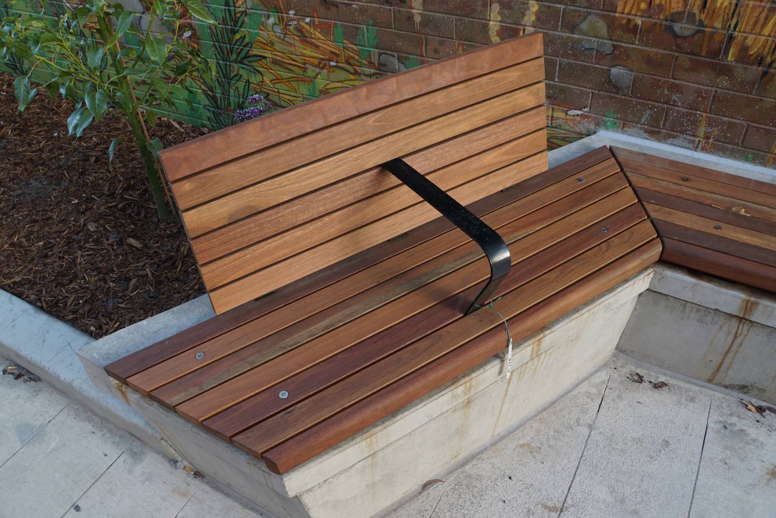 Custom suite of furniture for the upgrade of Bonwick Street shops in Fawkner. Wall mounted benches and seats, all measured and mitred to in-situ cast concrete walls. Circular wall top ottomans were also placed around the streetscape. Unique stainless steel and timber bollards were also utilised around the main intersection.