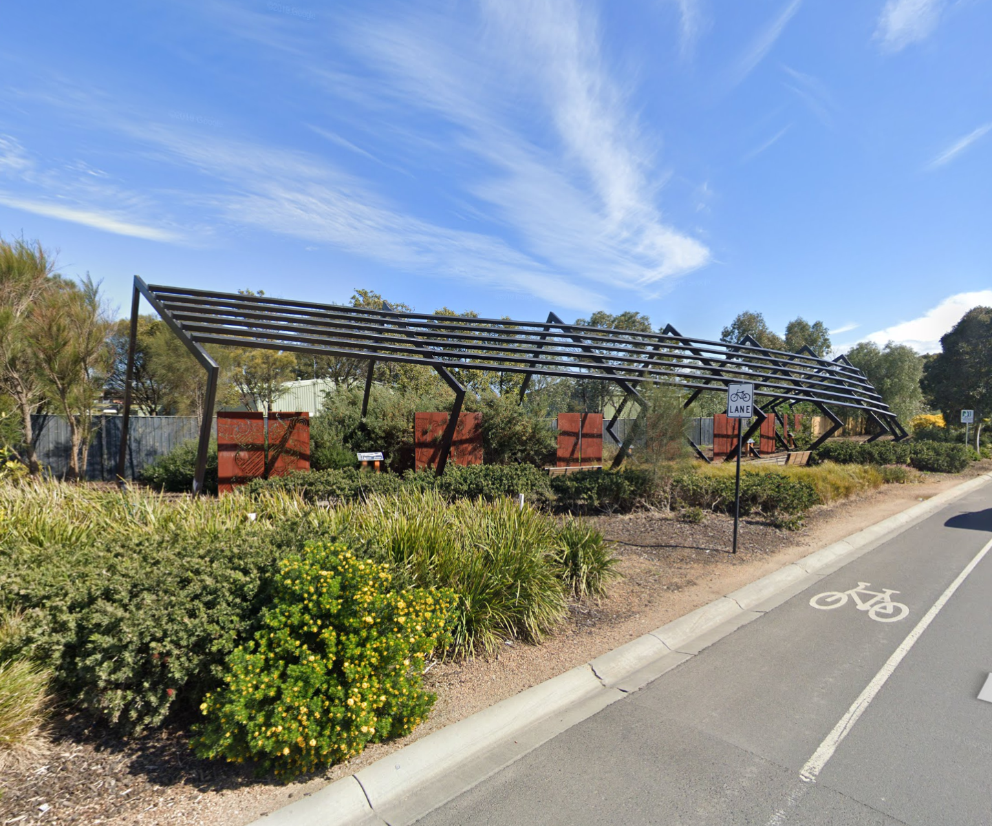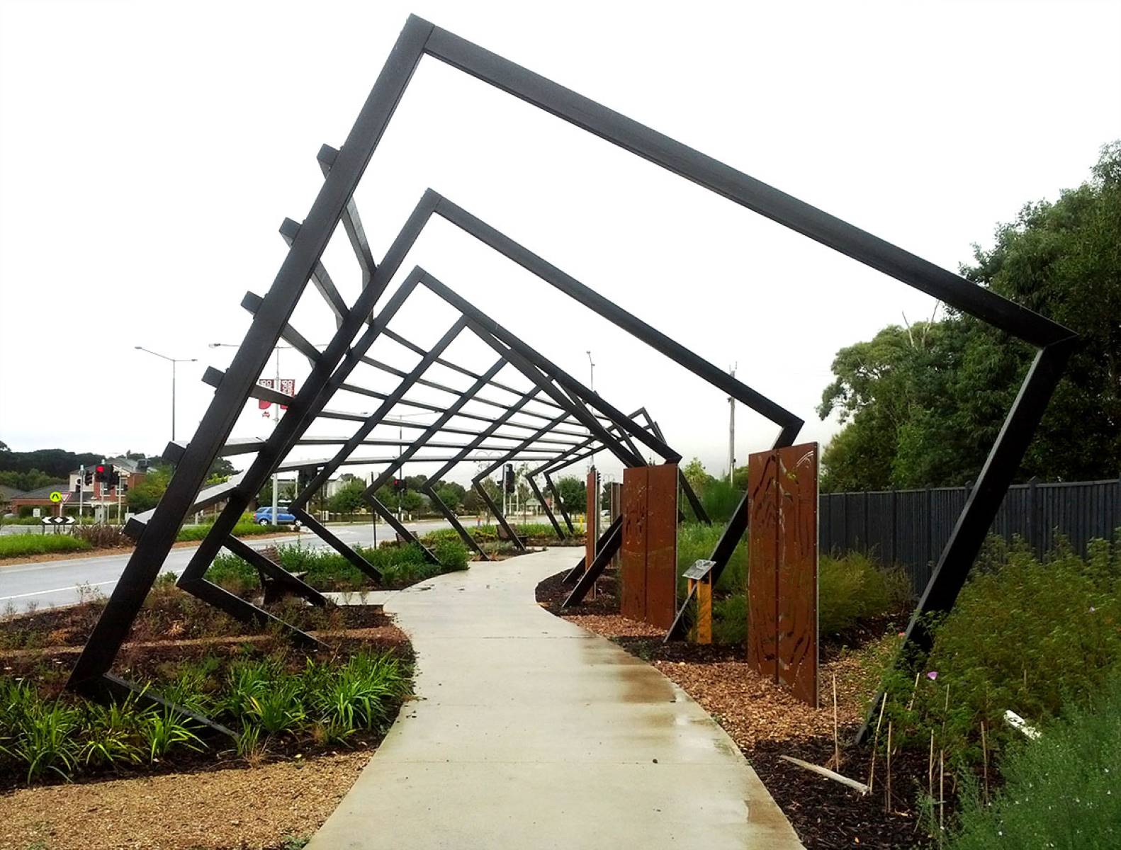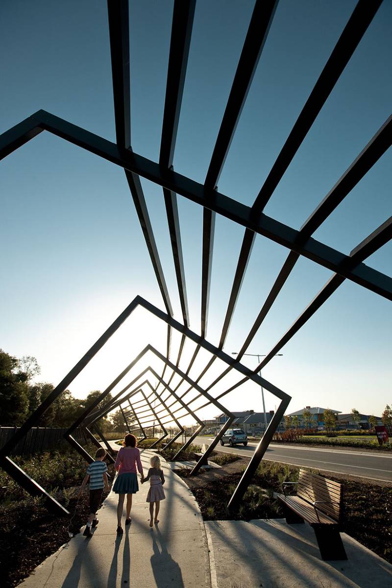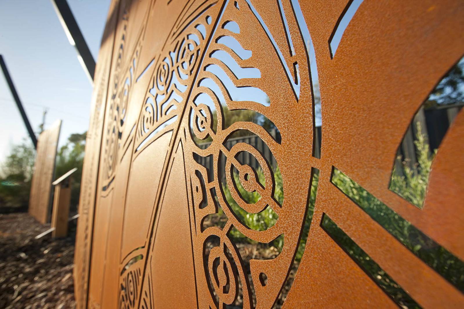 This two stage development is the very eye catching arbour and artwork package installed at the entrance of Casiana Grove Estate in Cranbourne West. The heavy steel arbour made on rotating steel frames with steel posts following the frames around the structure is a feat of engineering and design. Within the arbour are twelve individually designed aboriginal artwork panels made from corten, designed to weather and rust in the natural environment.