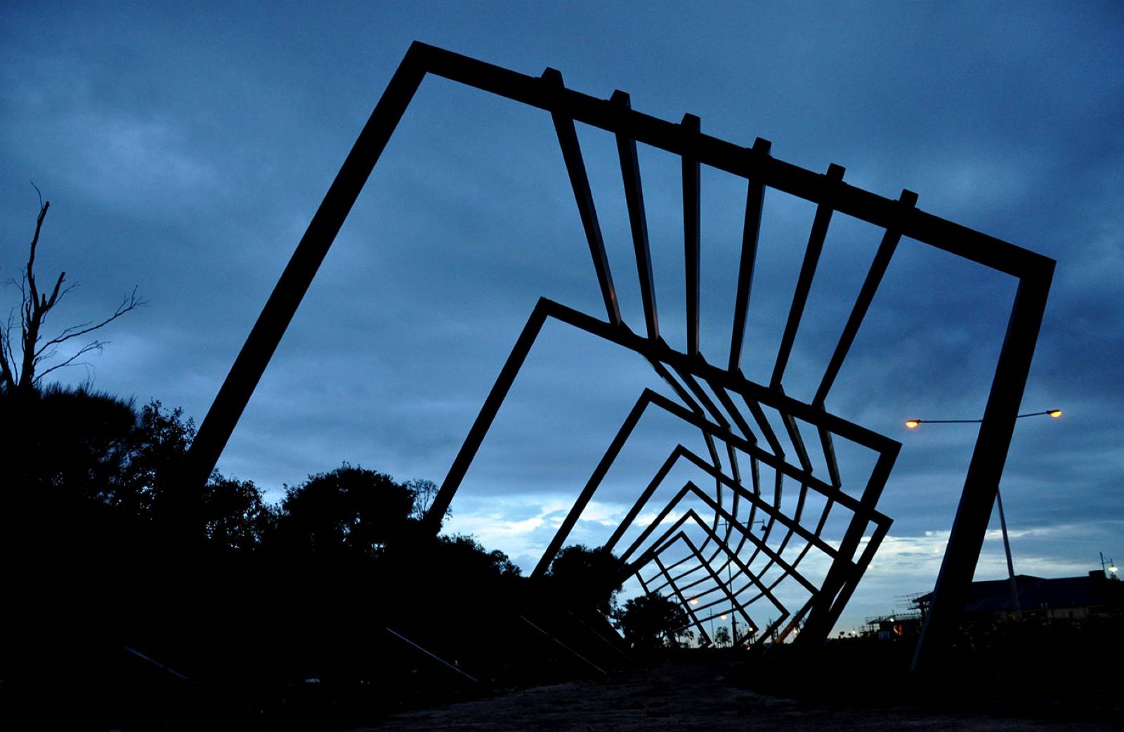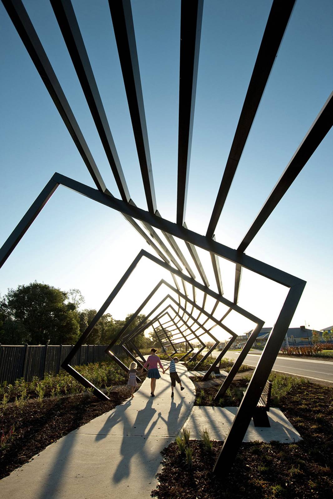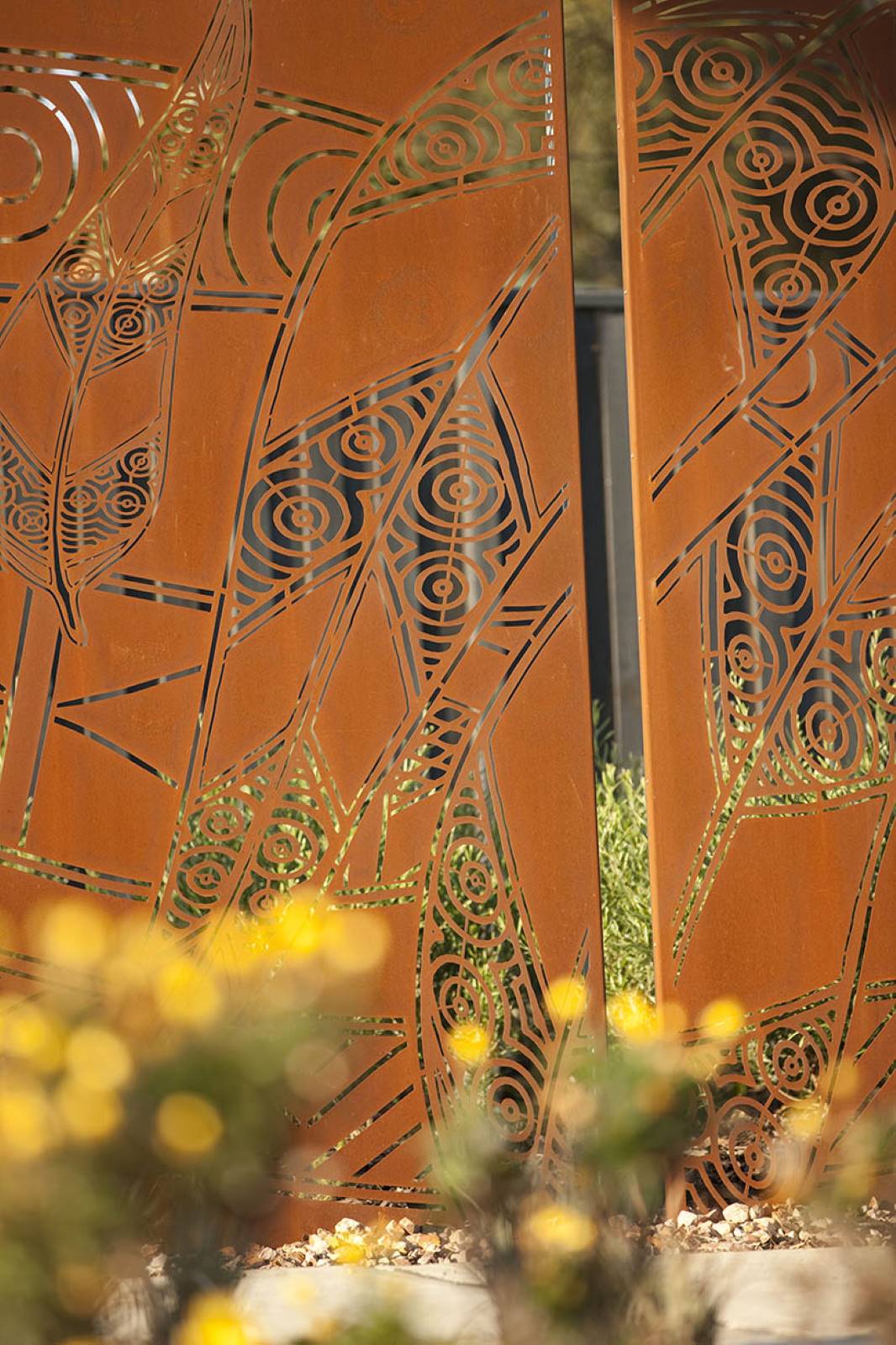 This two stage development is the very eye catching arbour and artwork package installed at the entrance of Casiana Grove Estate in Cranbourne West. The heavy steel arbour made on rotating steel frames with steel posts following the frames around the structure is a feat of engineering and design. Within the arbour are twelve individually designed aboriginal artwork panels made from corten, designed to weather and rust in the natural environment.