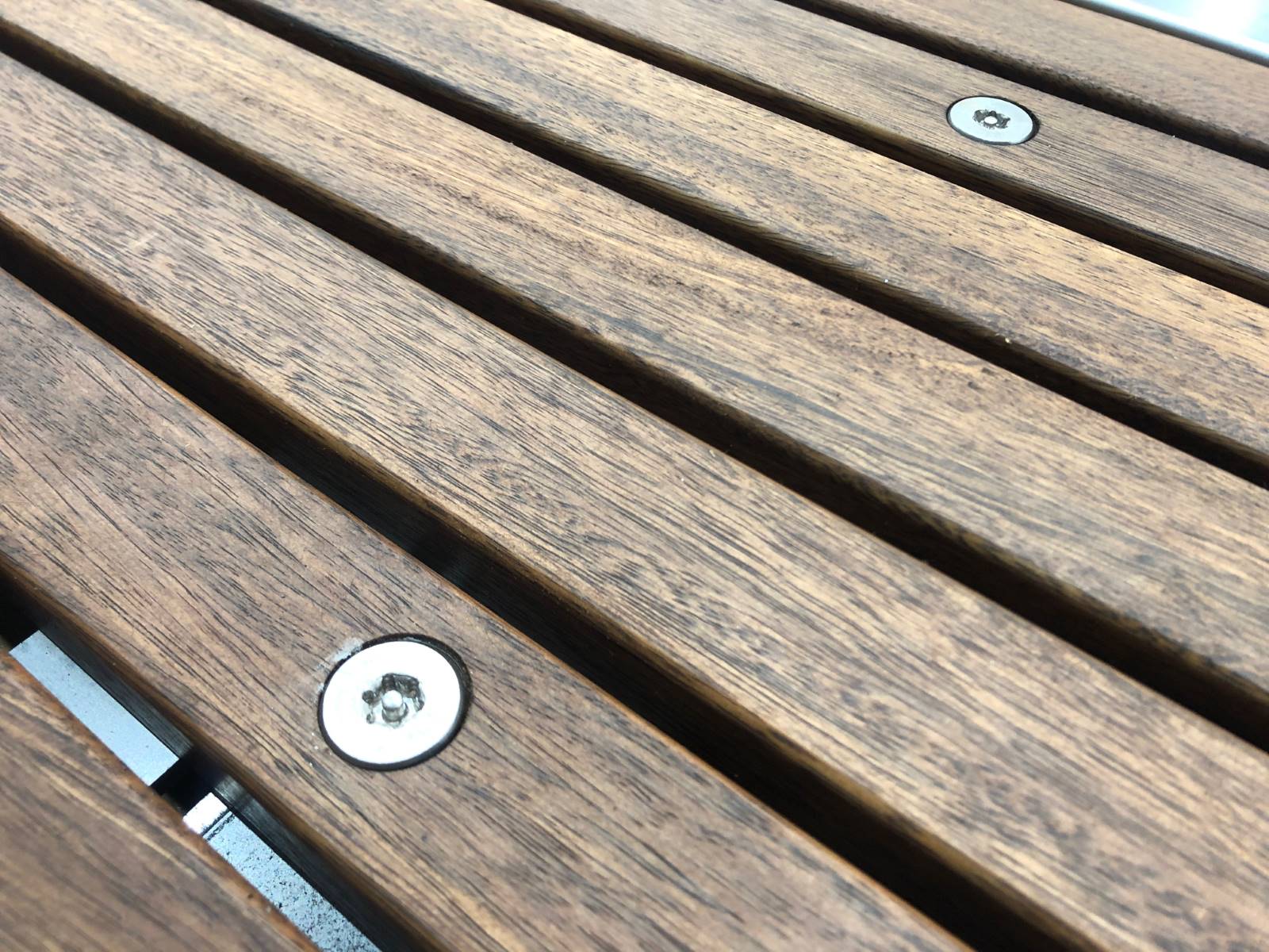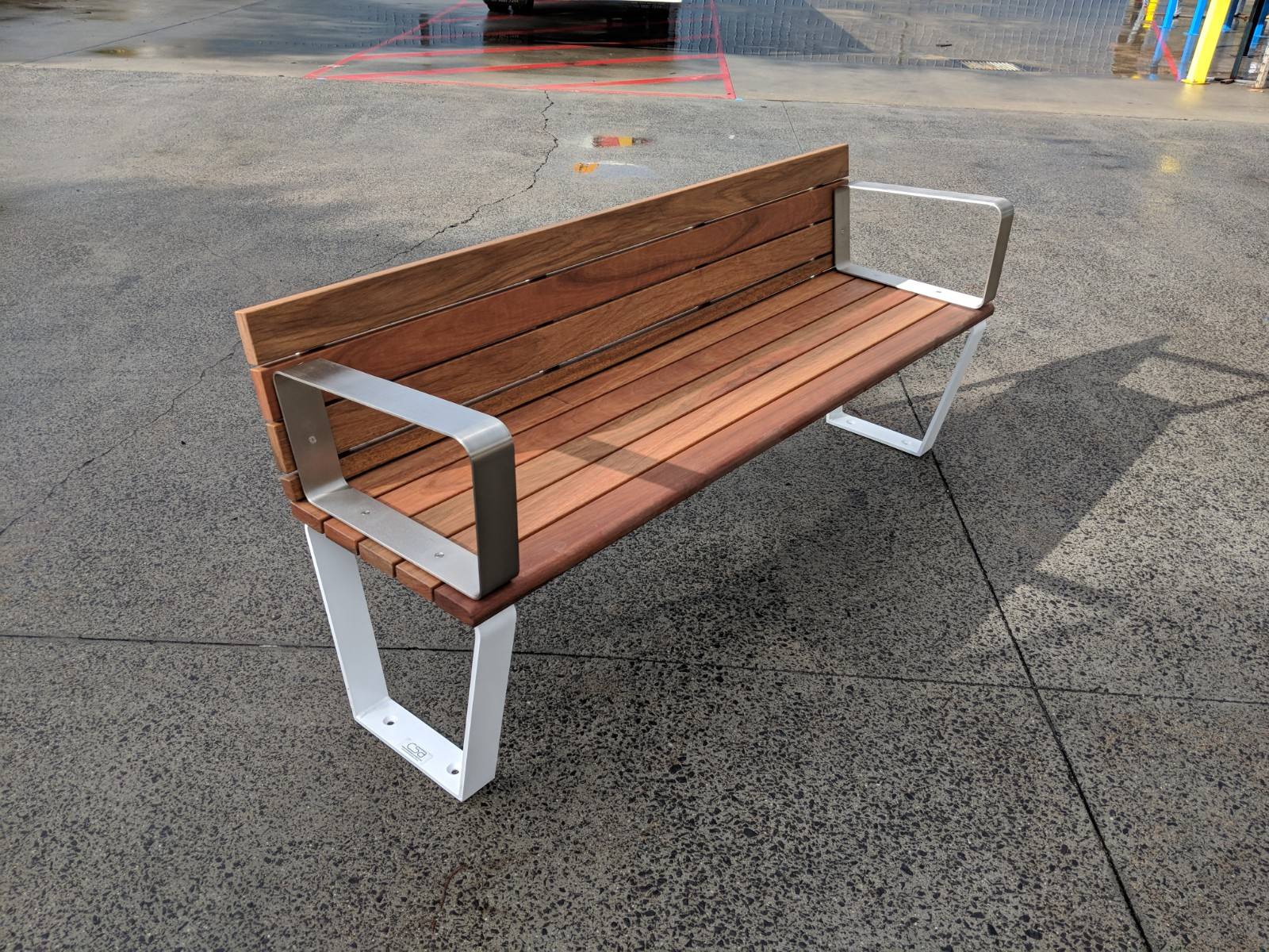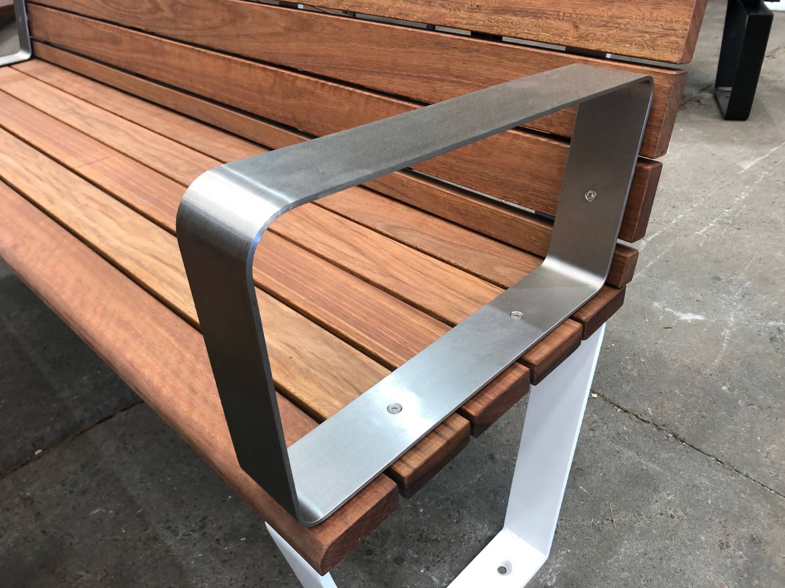 Furniture frames are mils steel powder coated White. Australian Spotted Gum timber battens. Seats have stainless steel polished arm rests.