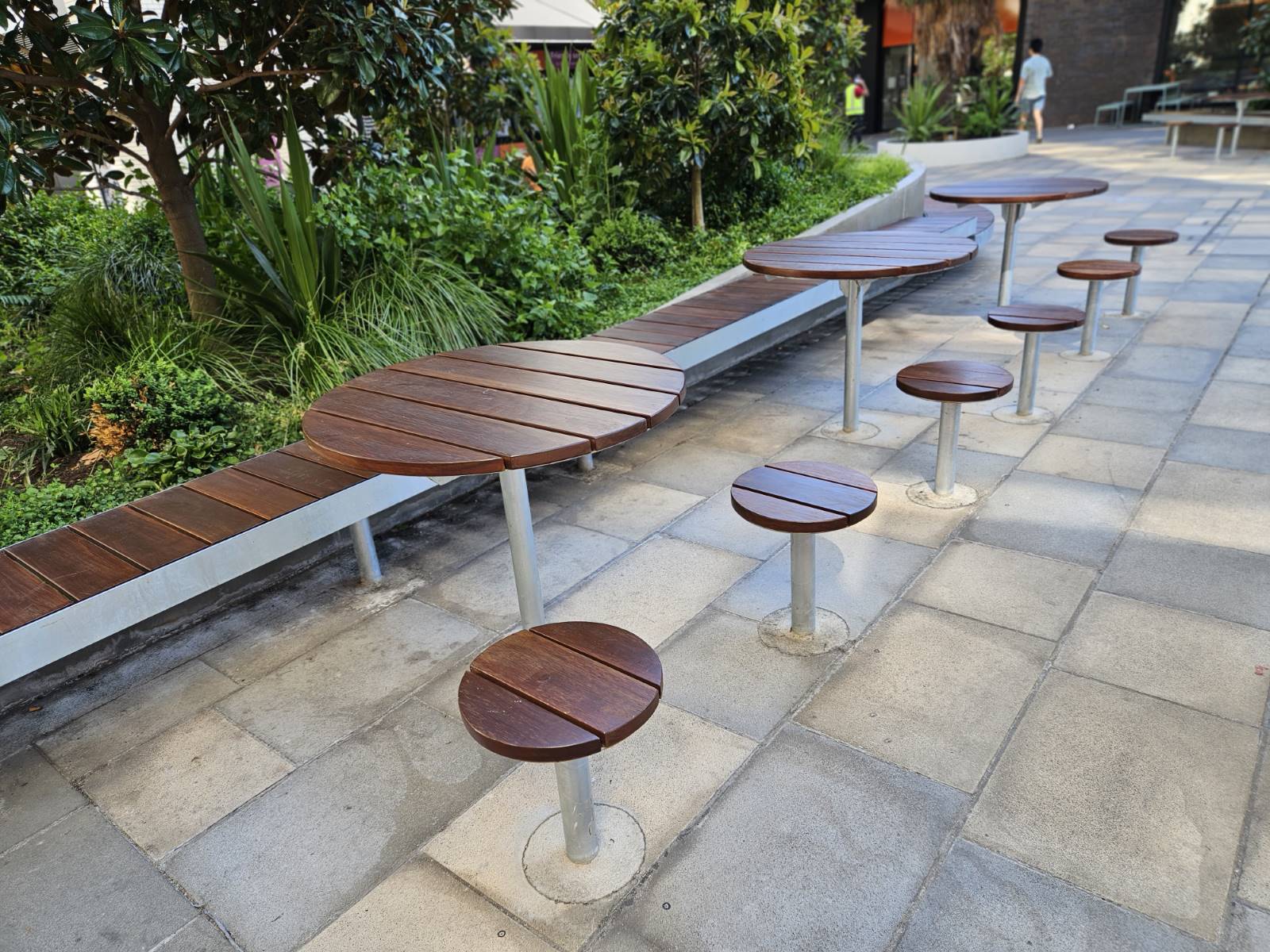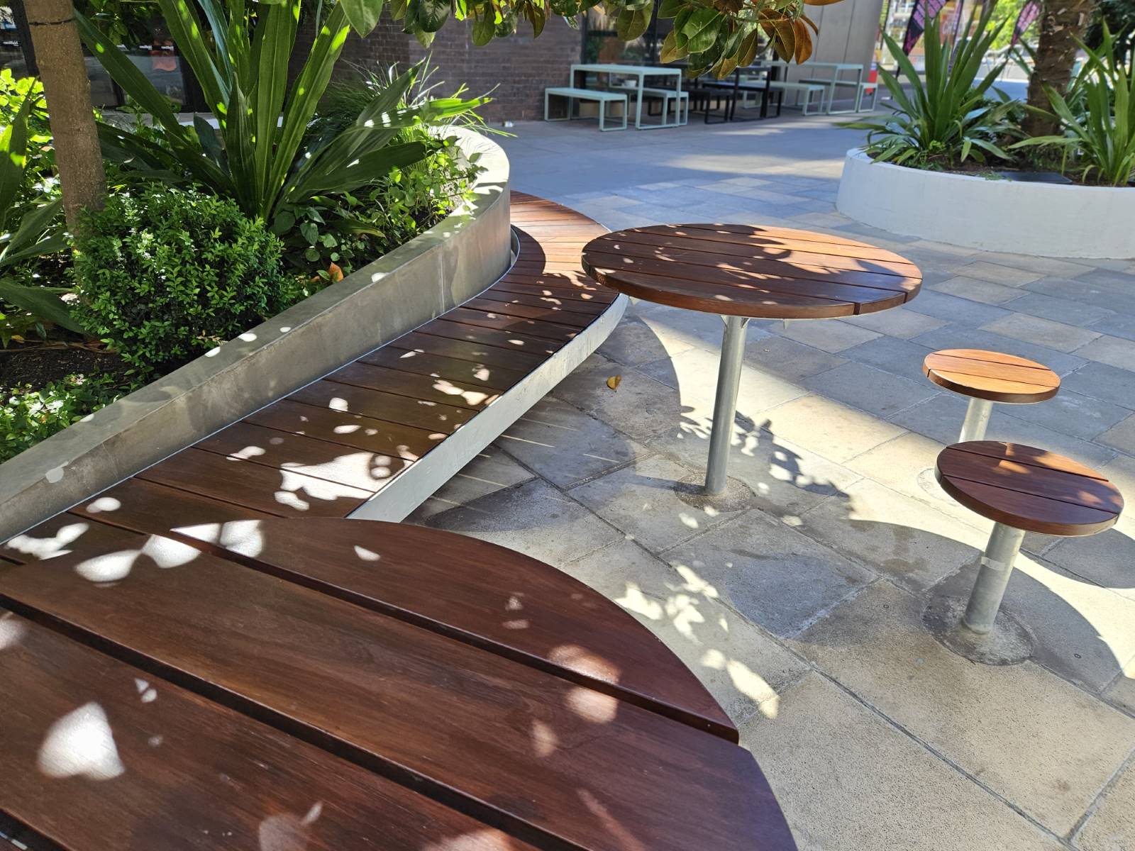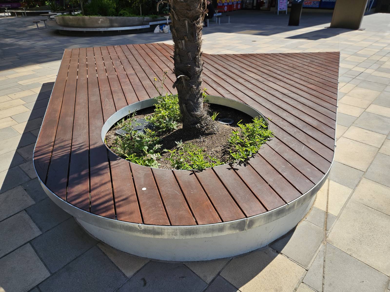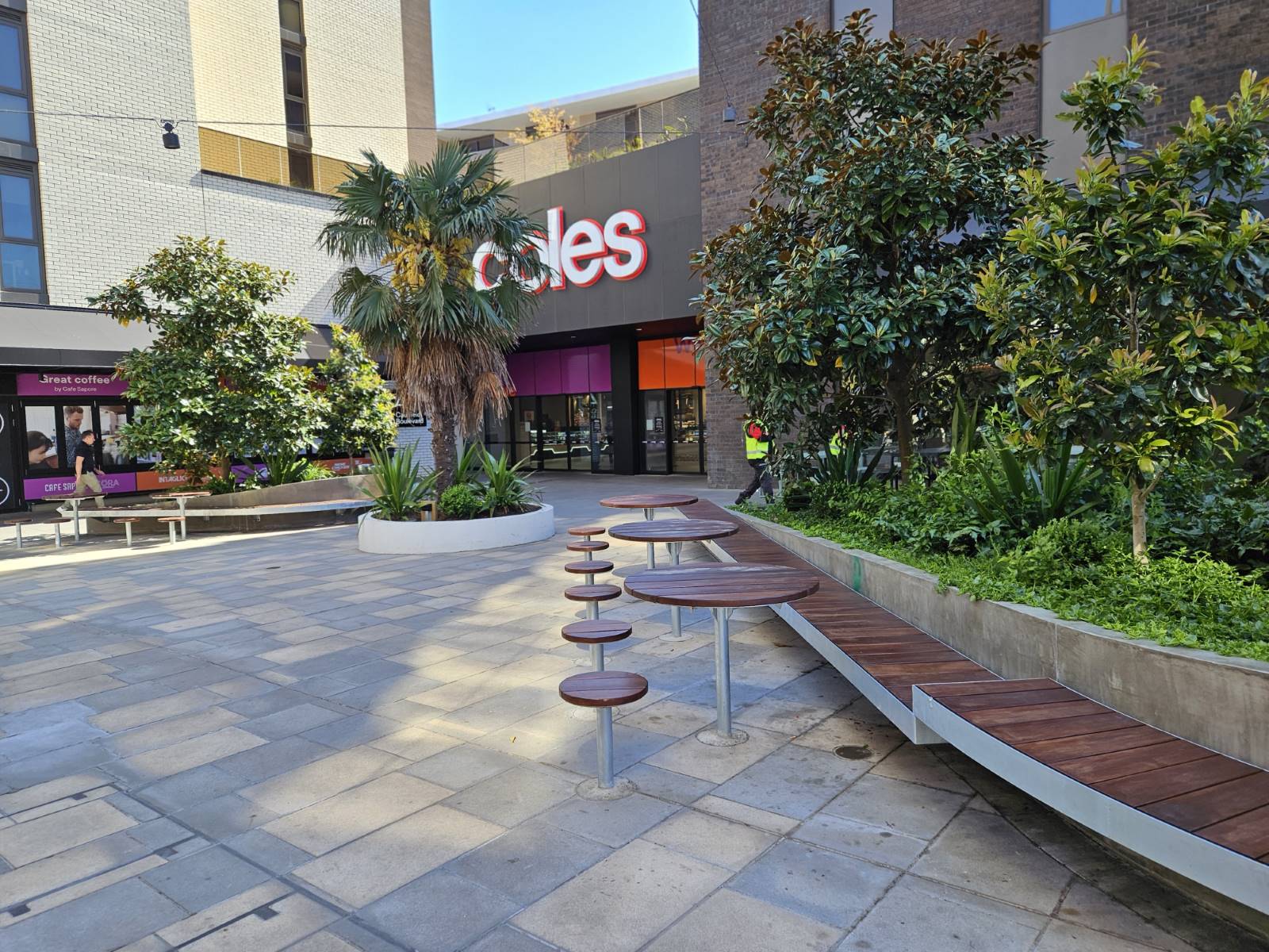 Design and manufacture of multiple seating elements for a new shopping precinct in Caulfield. Curved benches on multiple seating levels around in-situ concrete walls, circular stools and tables with a centerpiece platform to give the area many different seating options. Detailed stainless steel tree grates were also provided.