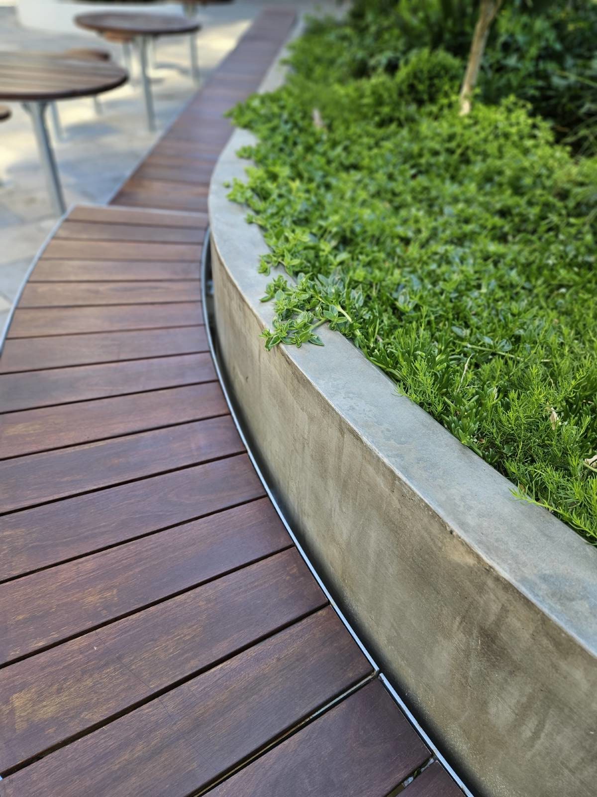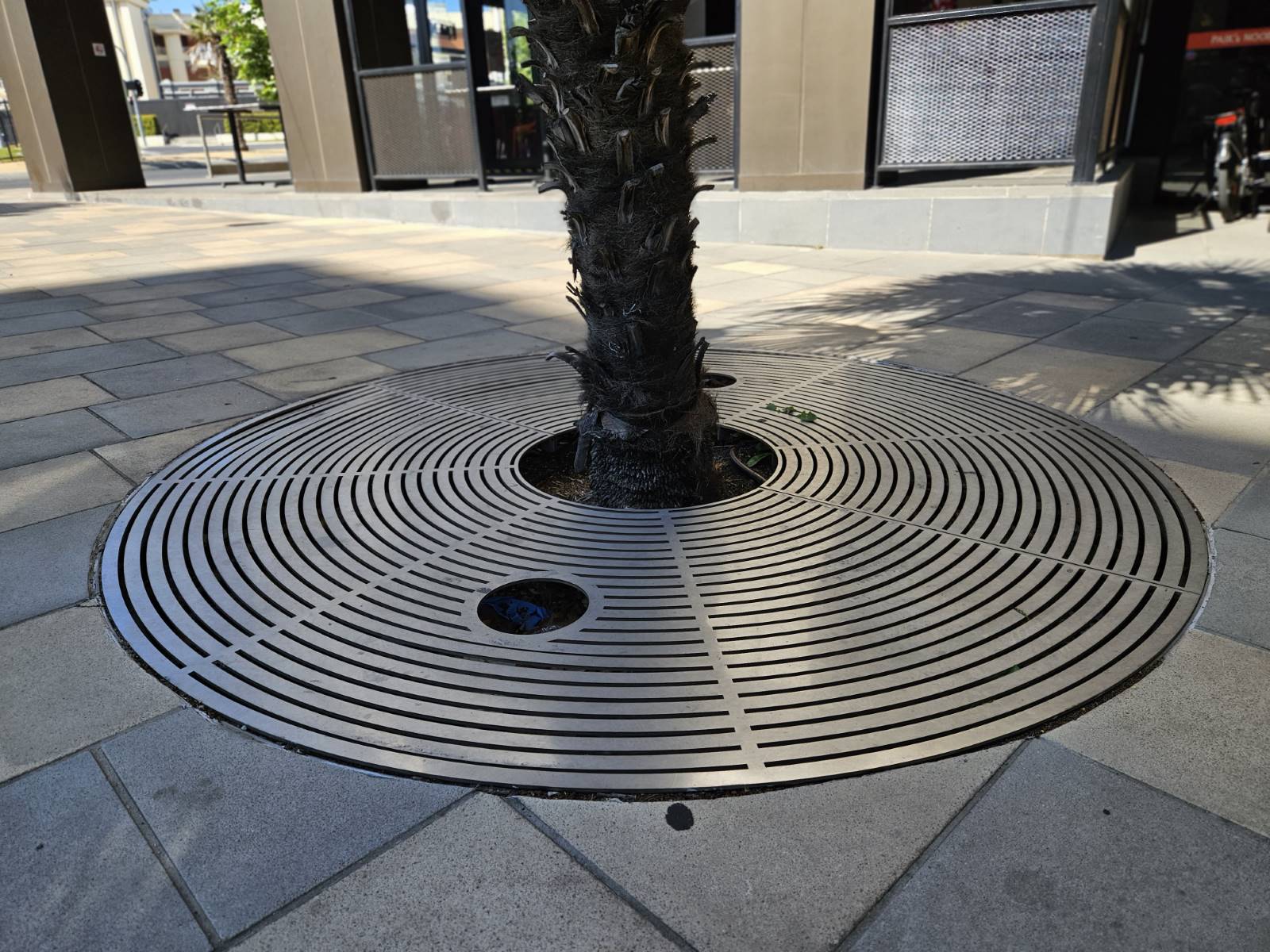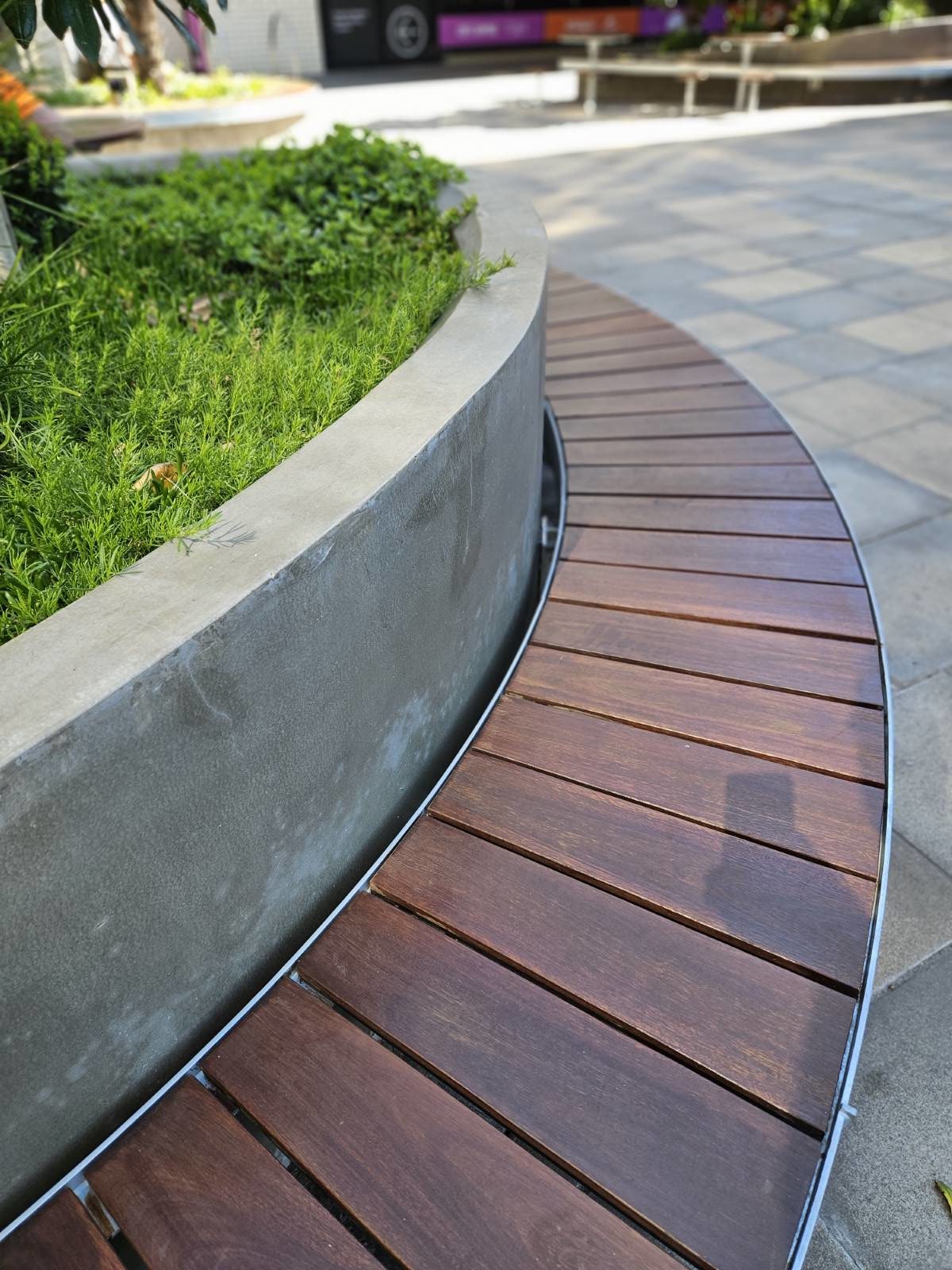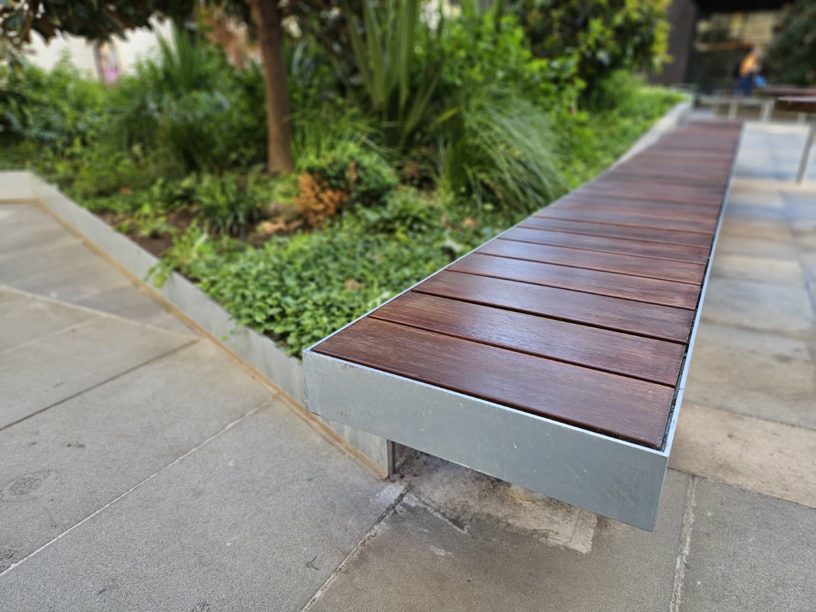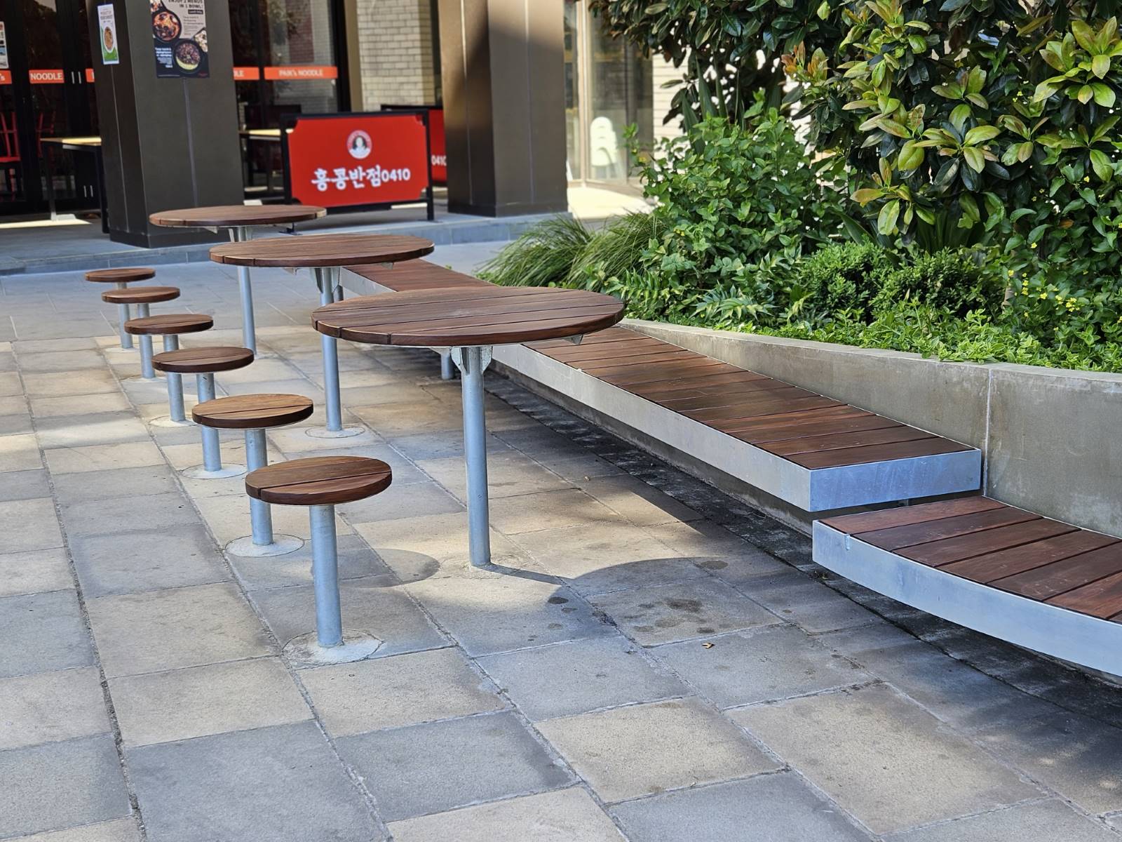 Design and manufacture of multiple seating elements for a new shopping precinct in Caulfield. Curved benches on multiple seating levels around in-situ concrete walls, circular stools and tables with a centerpiece platform to give the area many different seating options. Detailed stainless steel tree grates were also provided.