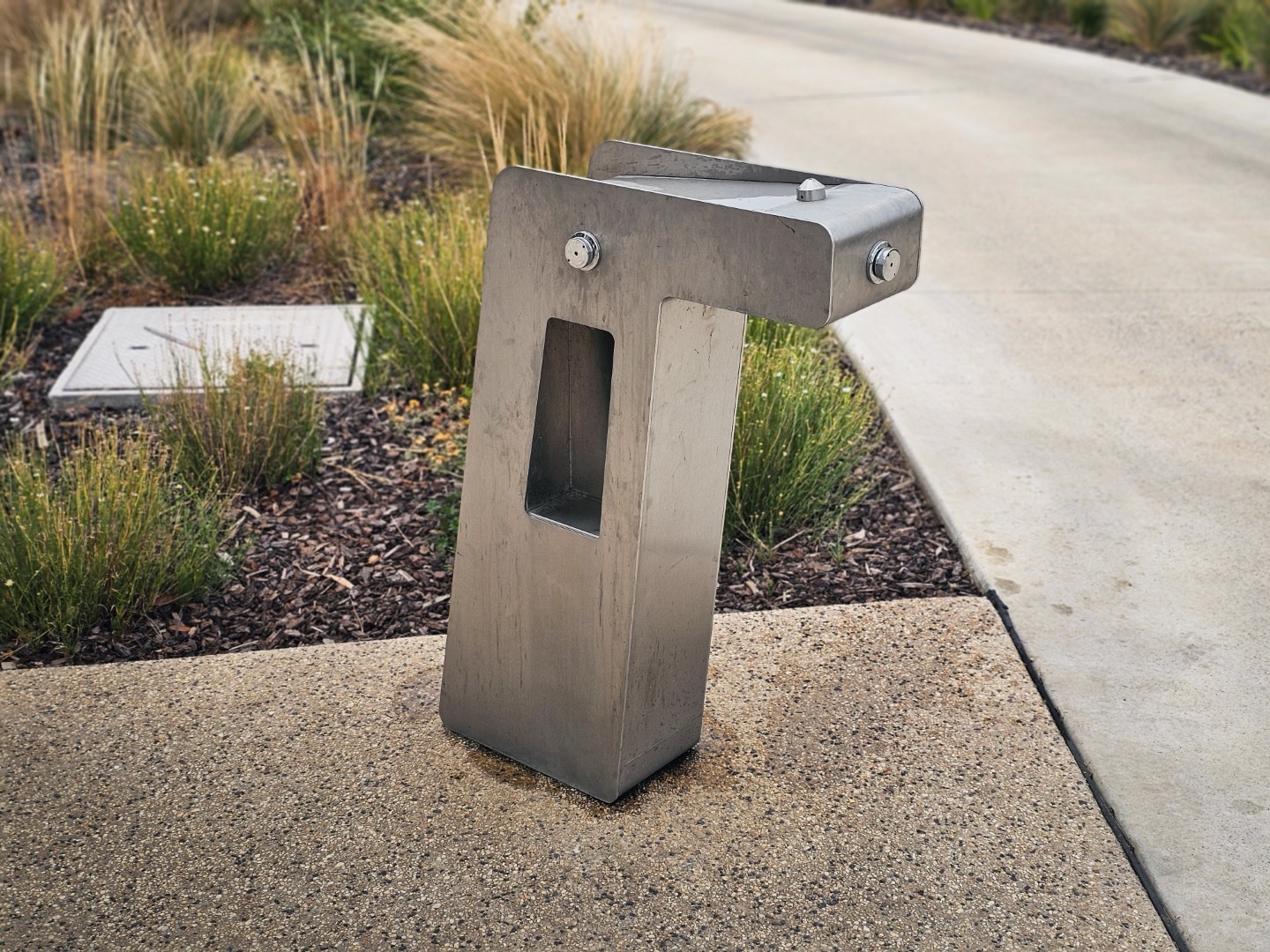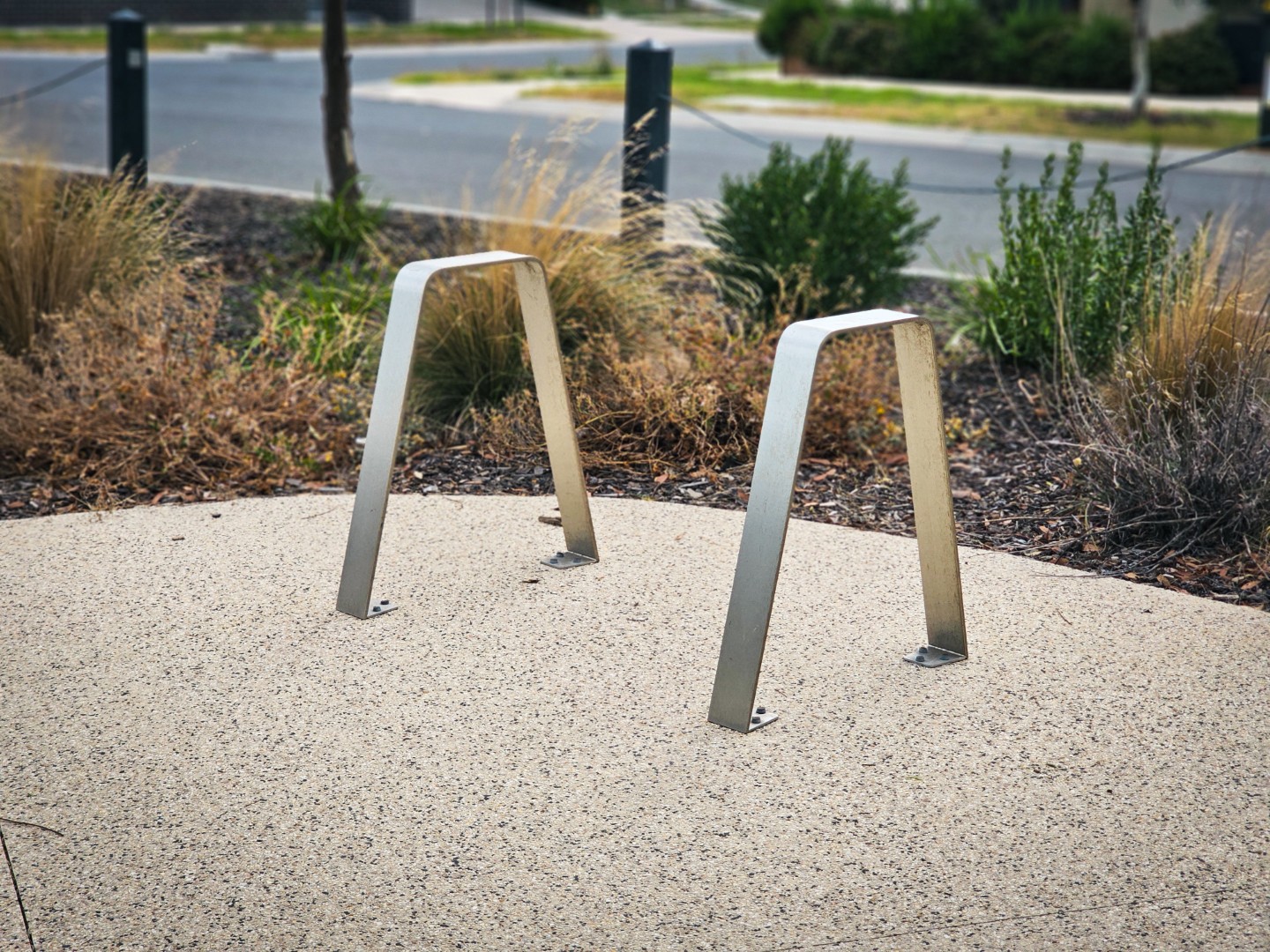 Mild steel galvanised and 2 pack polyurethane painted shelter, aluminium sheeting with woodgrain print lasercut in a chevron pattern. Internal gutter built into the shelter frame with drainage through the rear post. CSA also provided standard products to accompany the shelter, including stainless steel BR7102 Manhattan Bike Rails and DF5200 Lisboa Drinking Fountain.