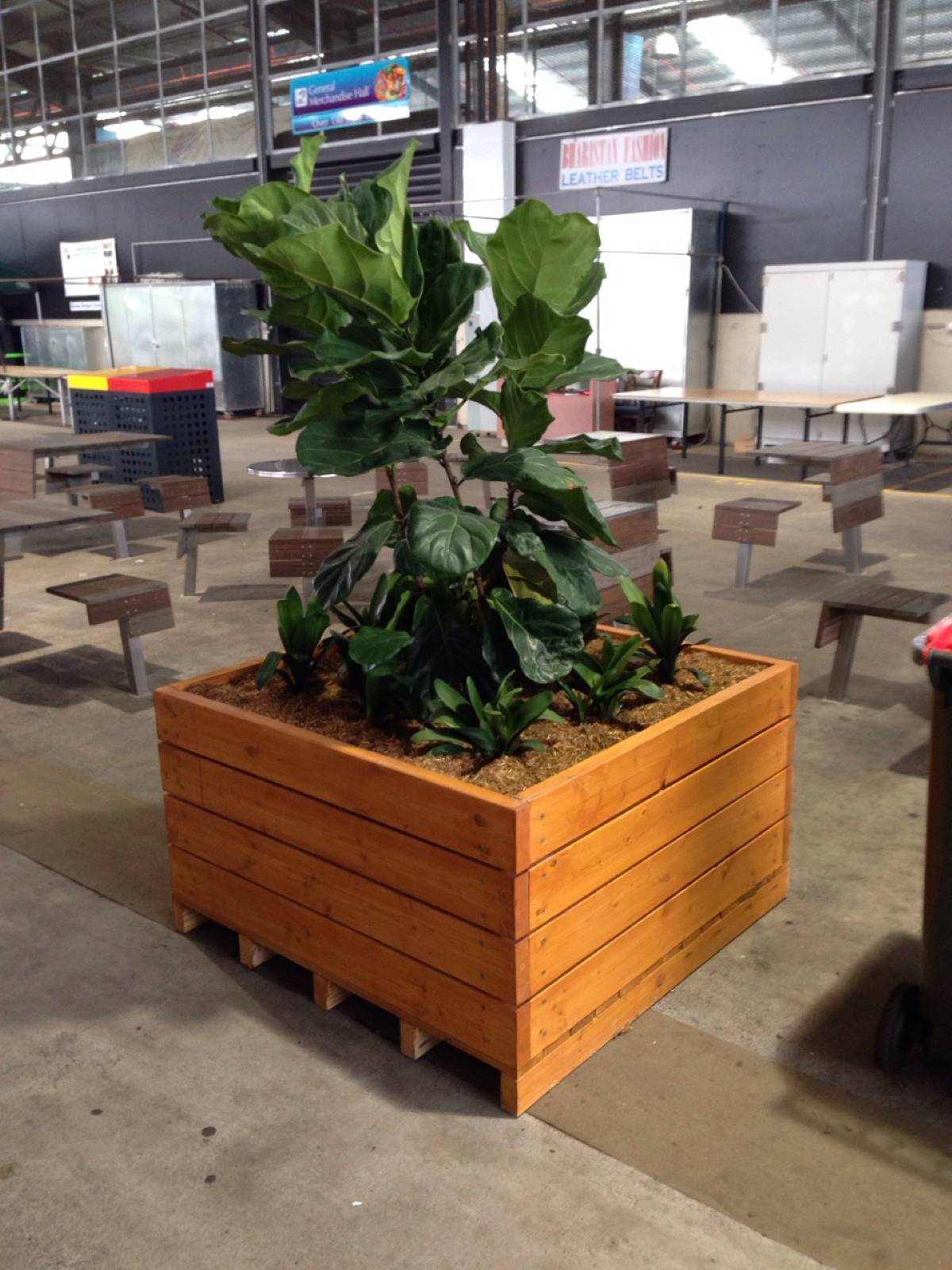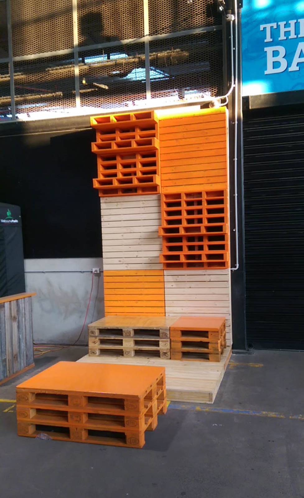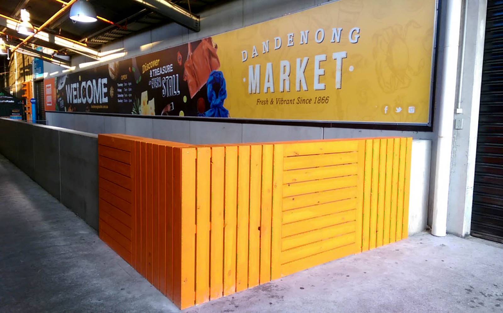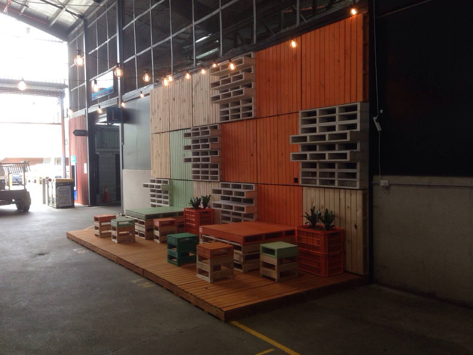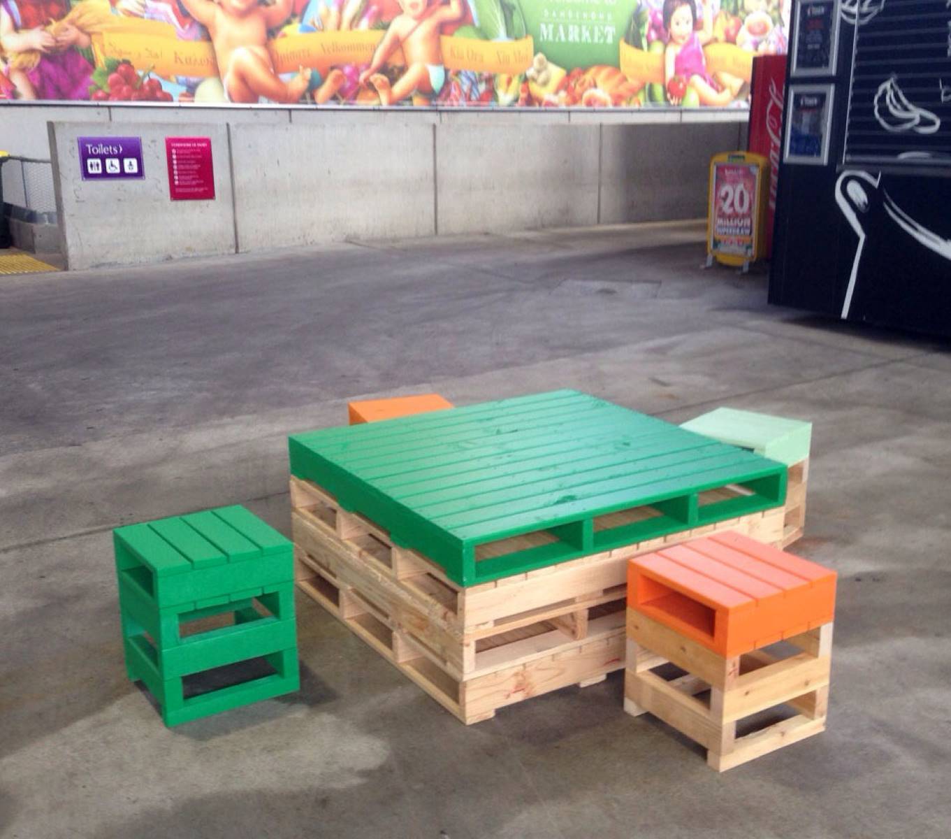Set of playful art & seating elements created using shipping pallets for the Dandenong Market