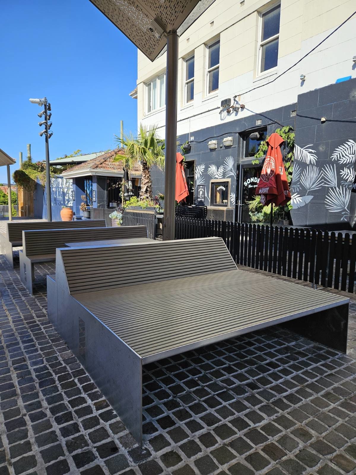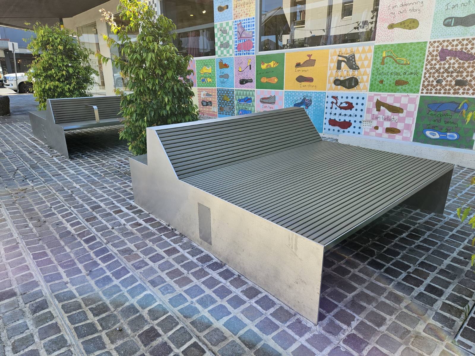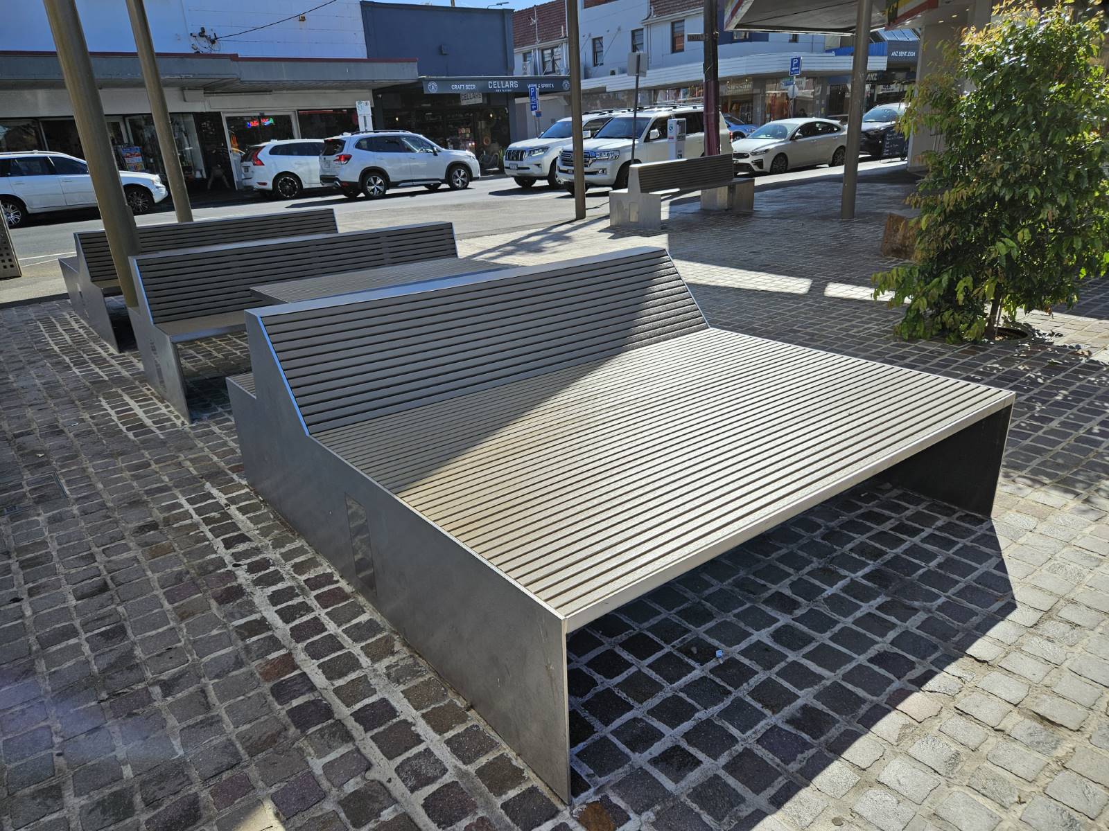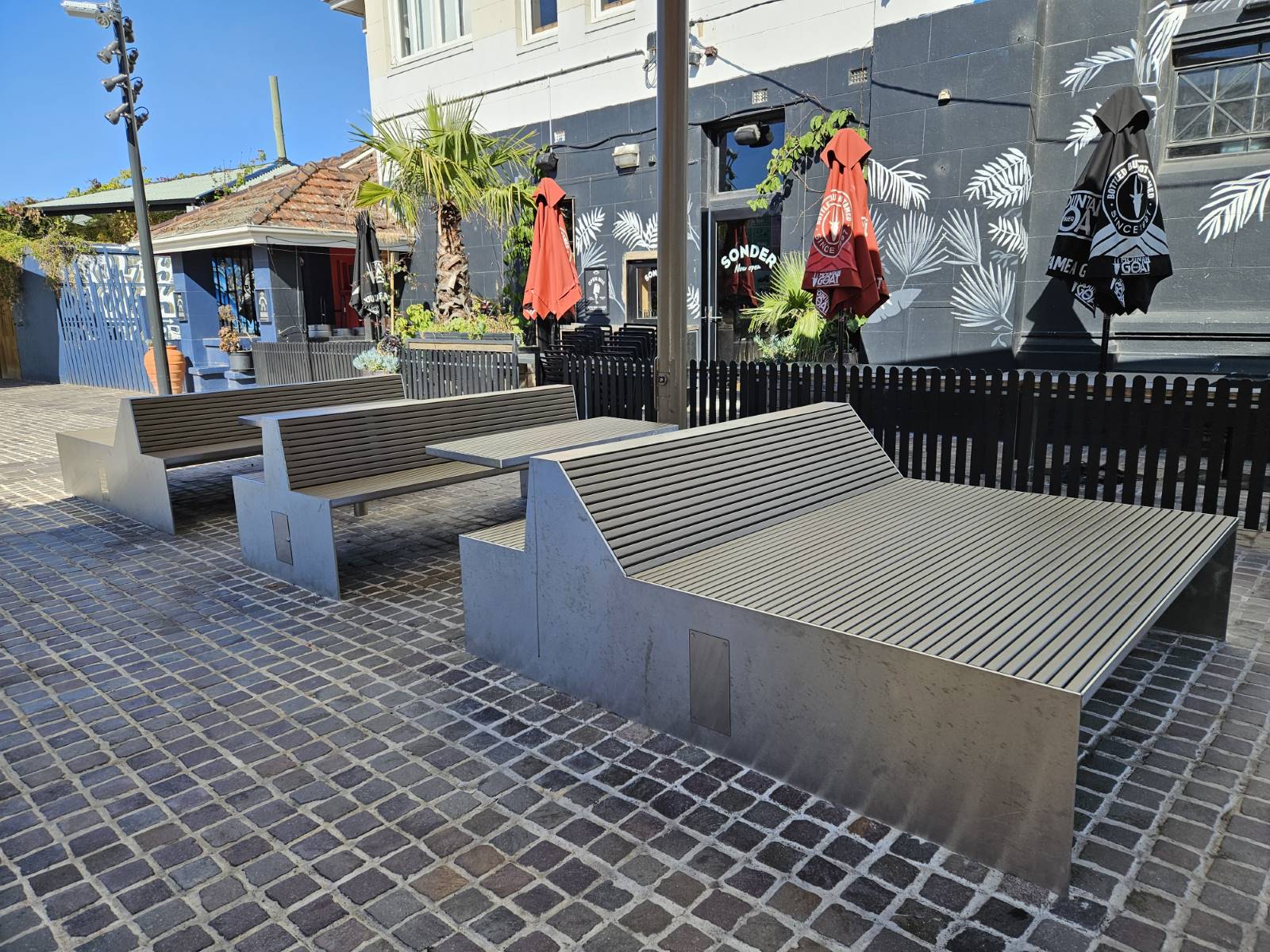 A custom suite of heavy seats and seating platforms constructed in 316 grade stainless steel for the beach adjacent location. Finished with long lasting and maintenance free Enviroslat battens, this furniture will stand the test of time.