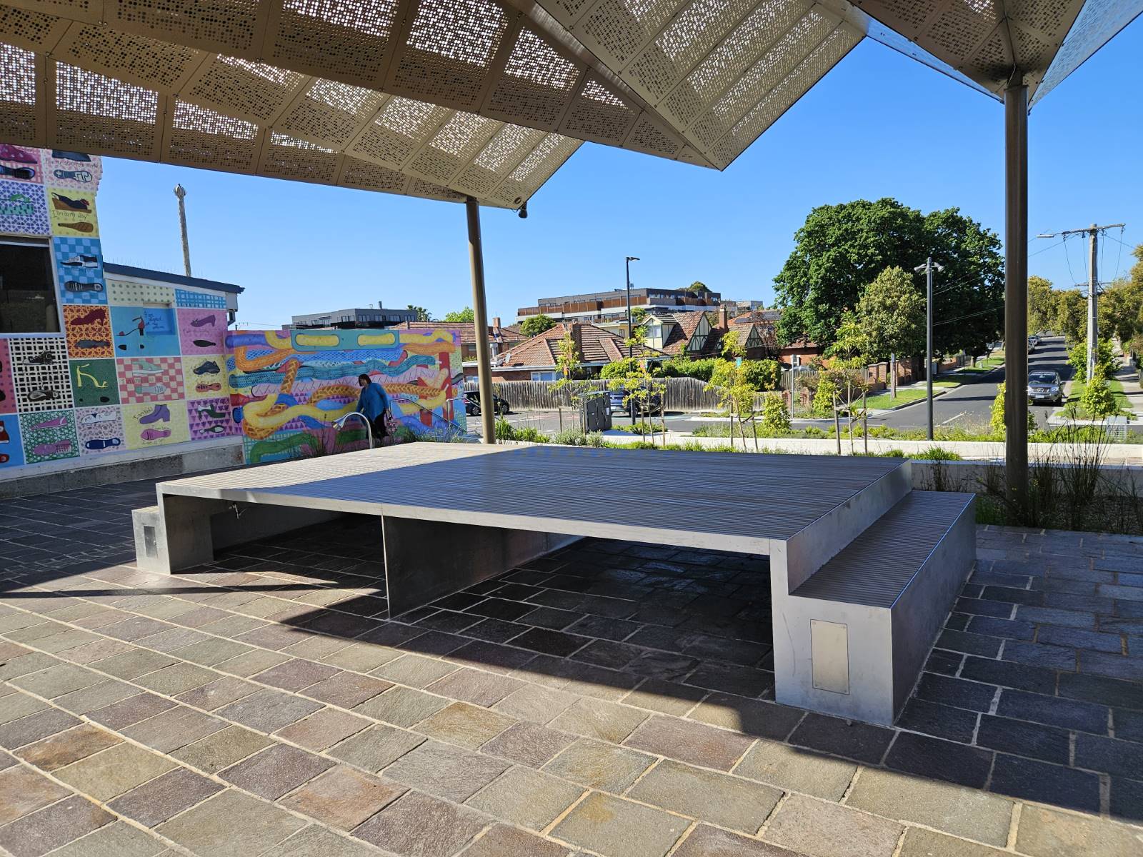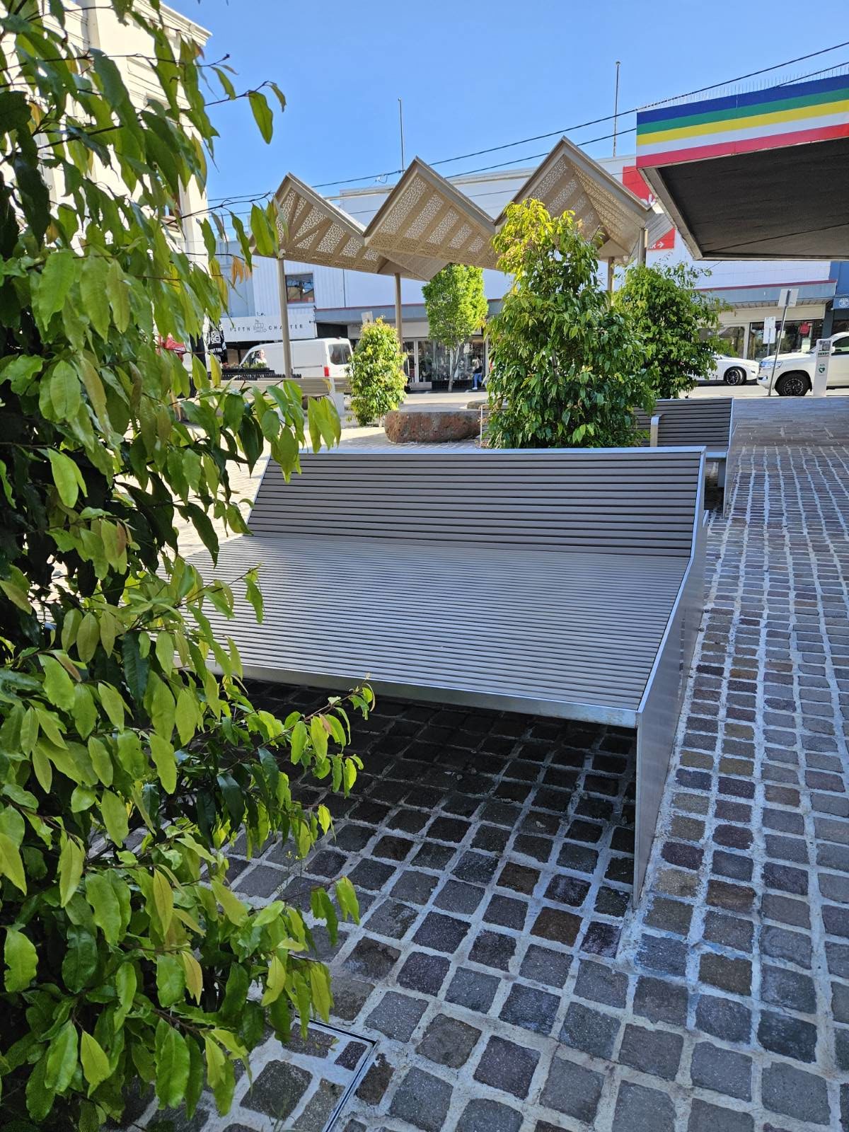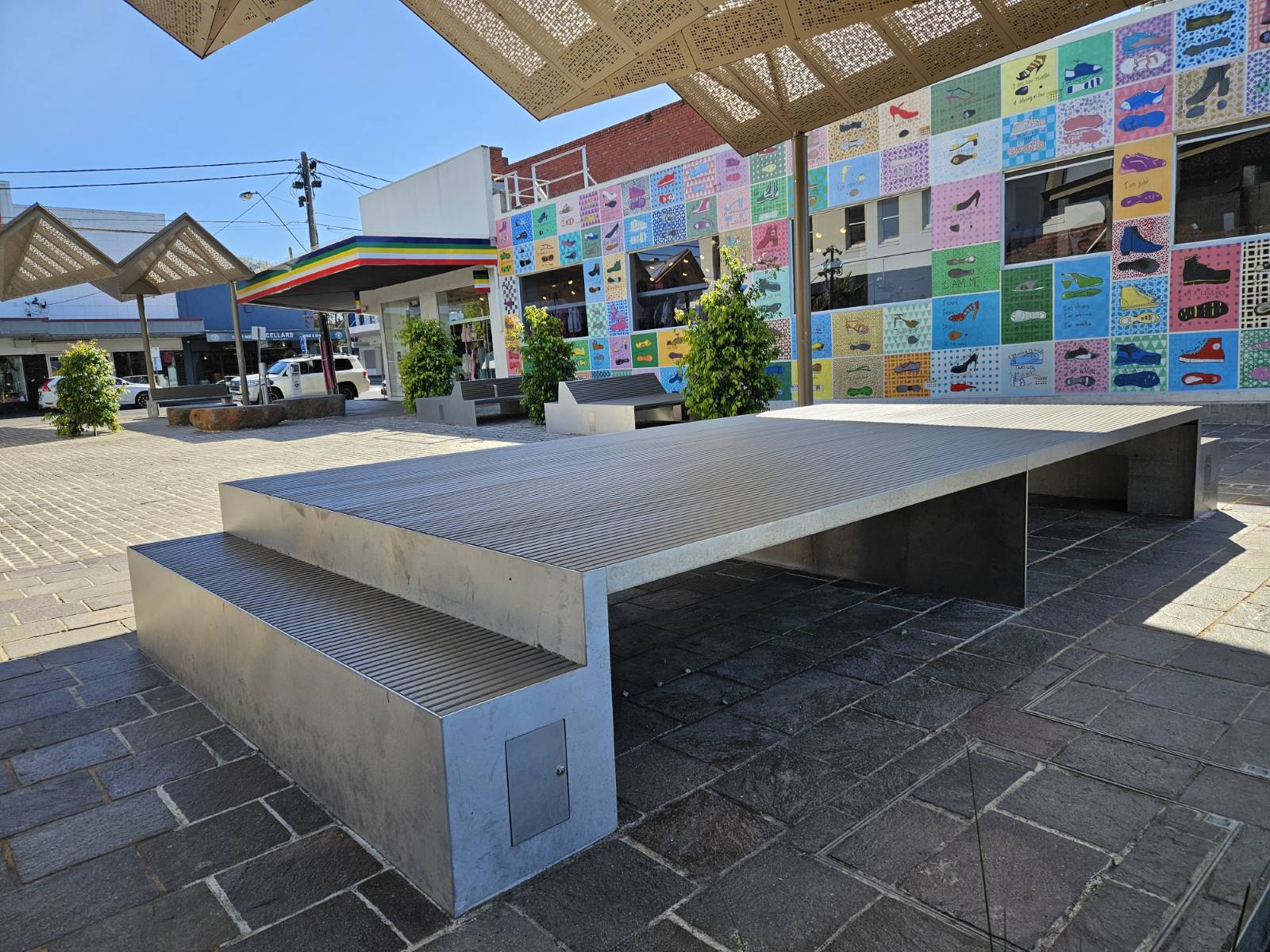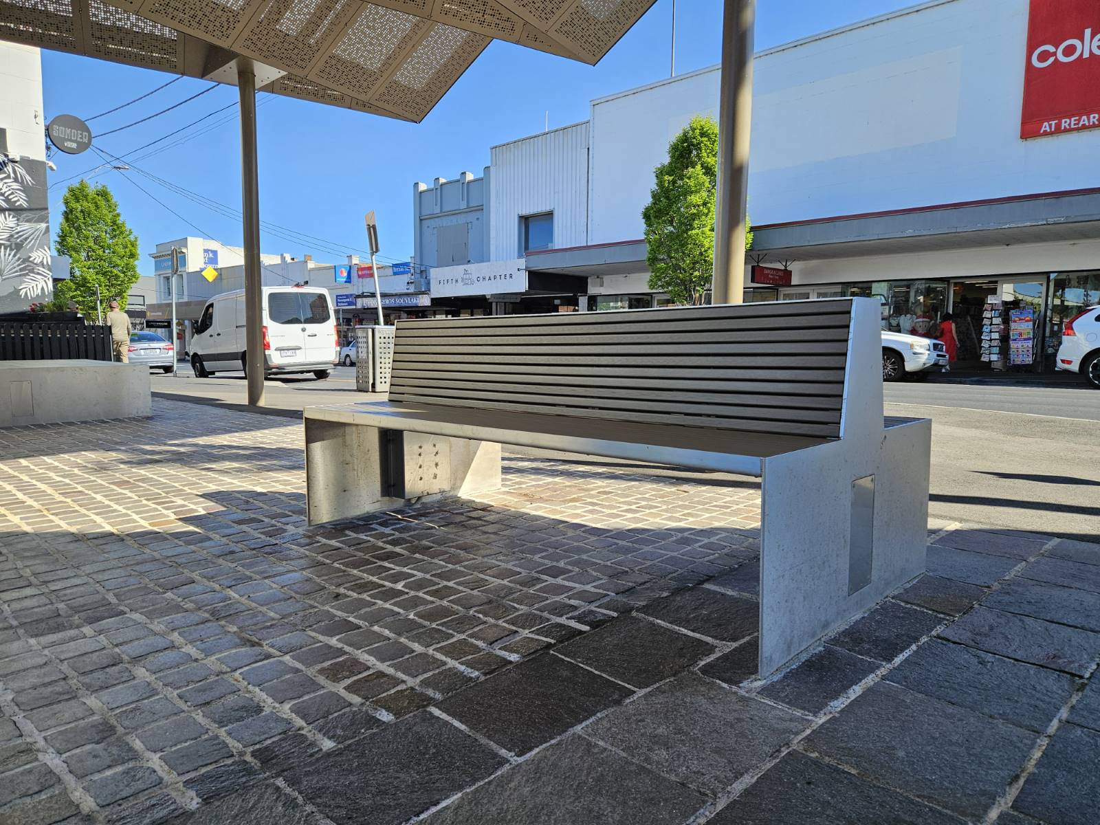 A custom suite of heavy seats and seating platforms constructed in 316 grade stainless steel for the beach adjacent location. Finished with long lasting and maintenance free Enviroslat battens, this furniture will stand the test of time.