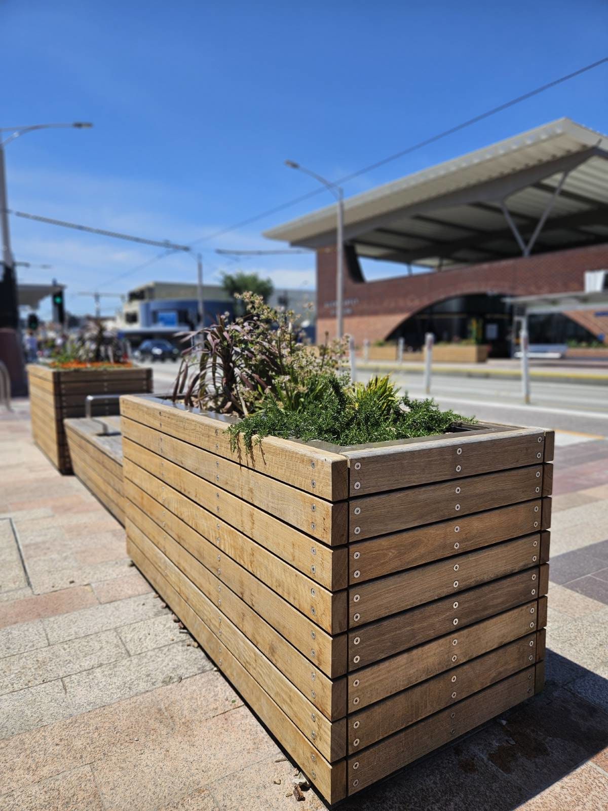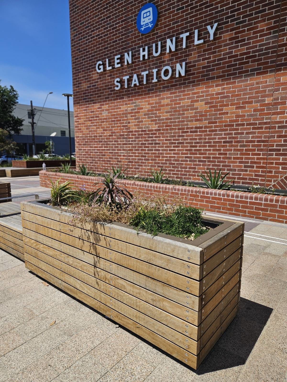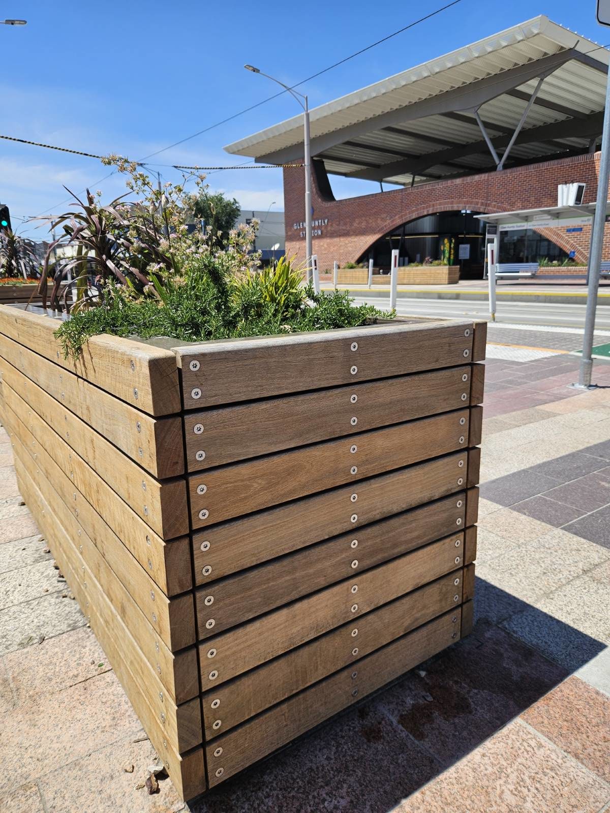 To go with the stainless steel platform seating and the bespoke timber seating at the stations entrance to the station, CSA also later supplied some heavy duty planters to complete the area.