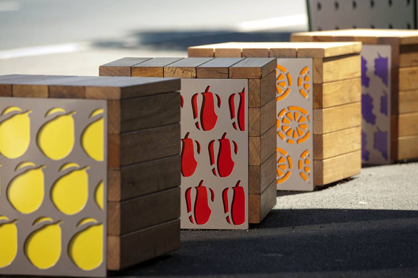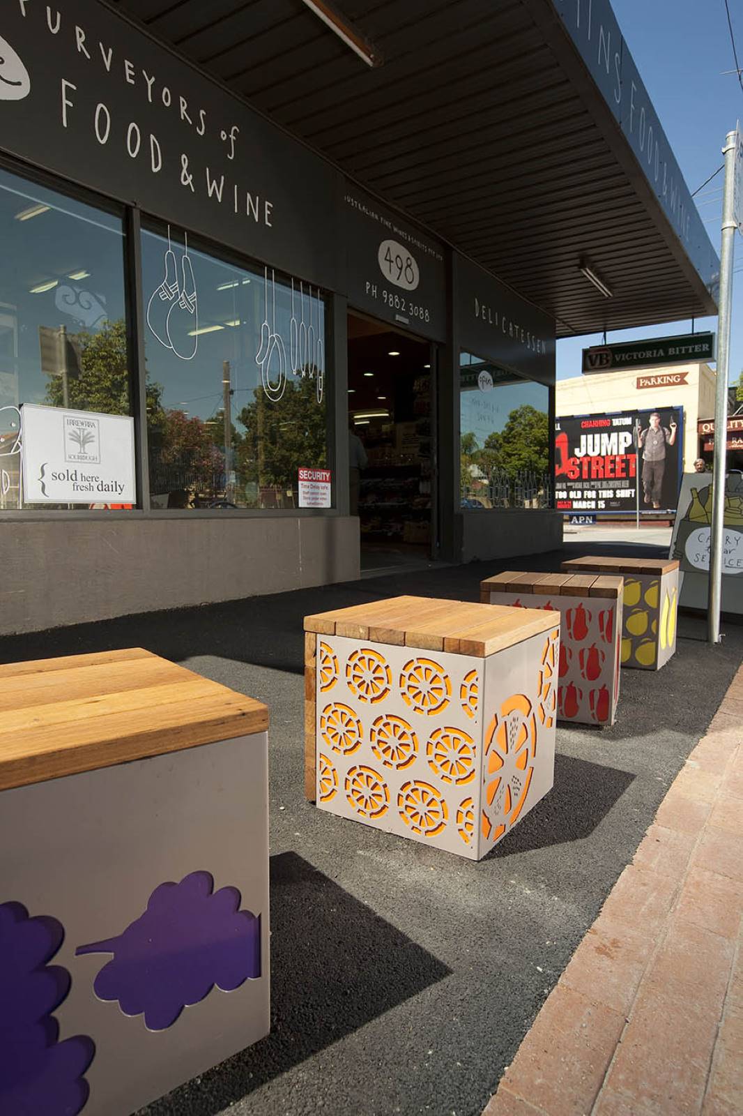 These playful fruit stools were designed and installed in front of a greengrocer in Hawthorn East. Multiple colours and perforation styles were used to create these interesting and eye catching designs.