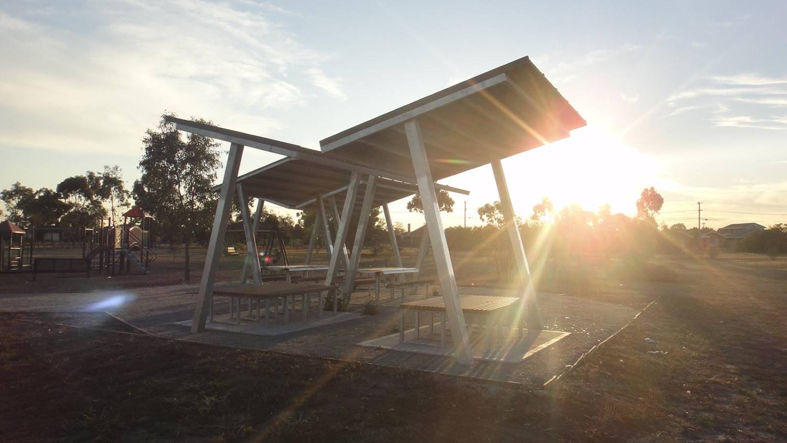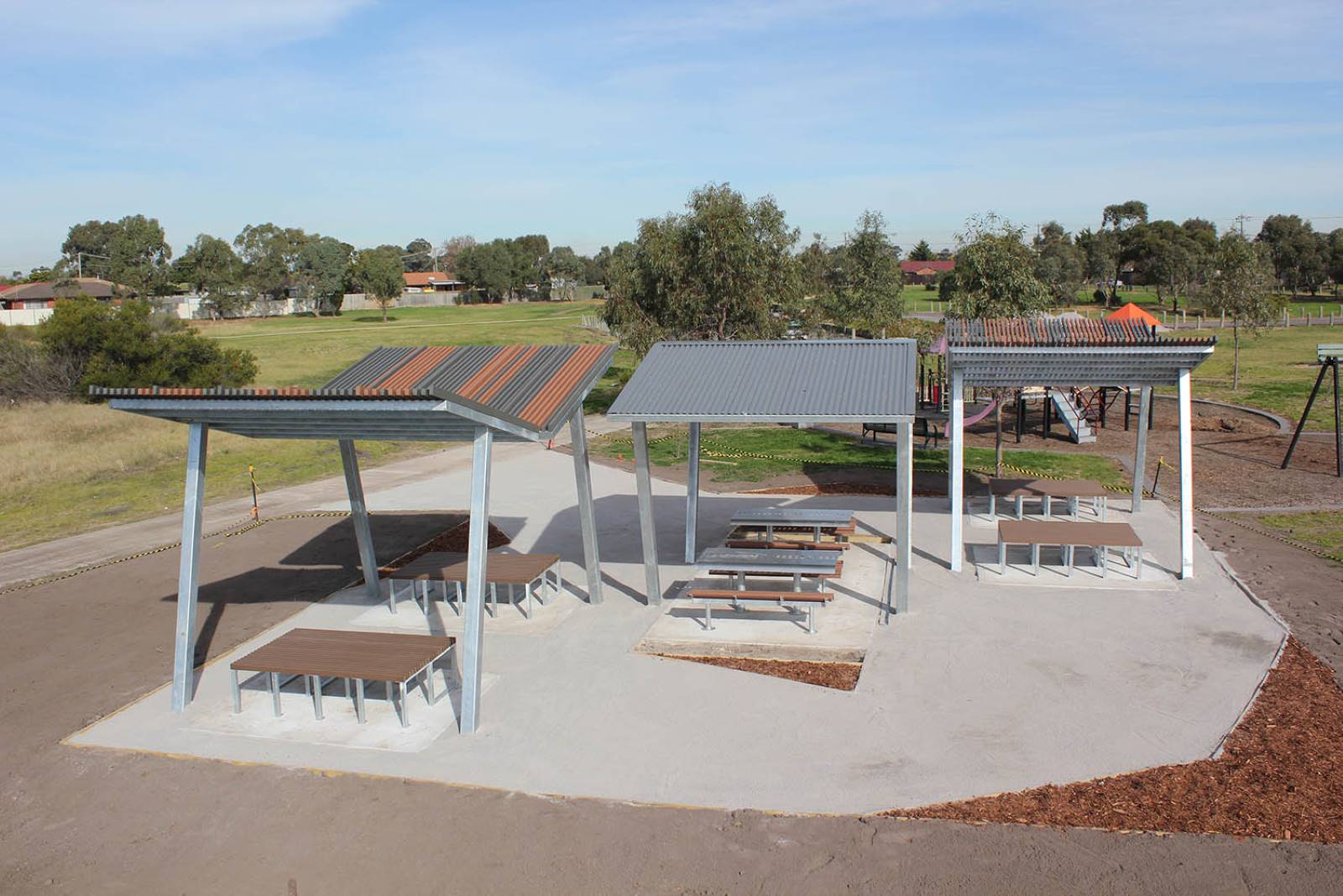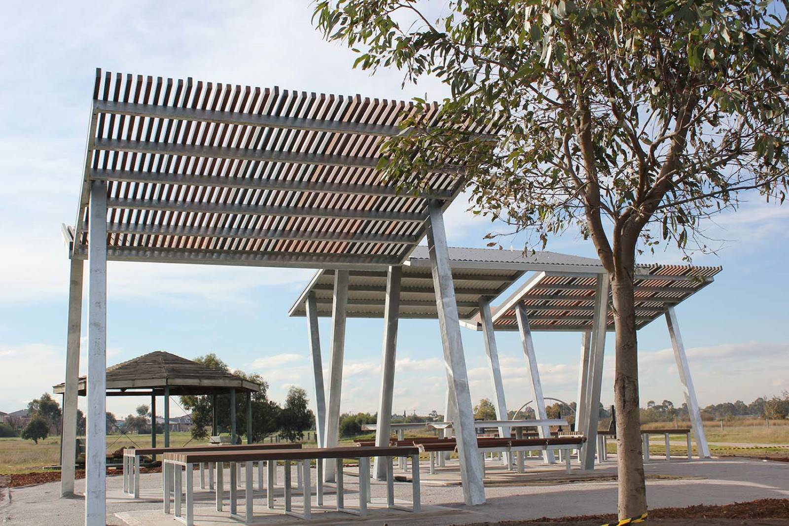 Mild steel frames, hot dipped galvanised. 60x40mm Enviroslat battens in multiple colours for the shade shelters and furniture. The centre shelters use colorbond roof sheeting.