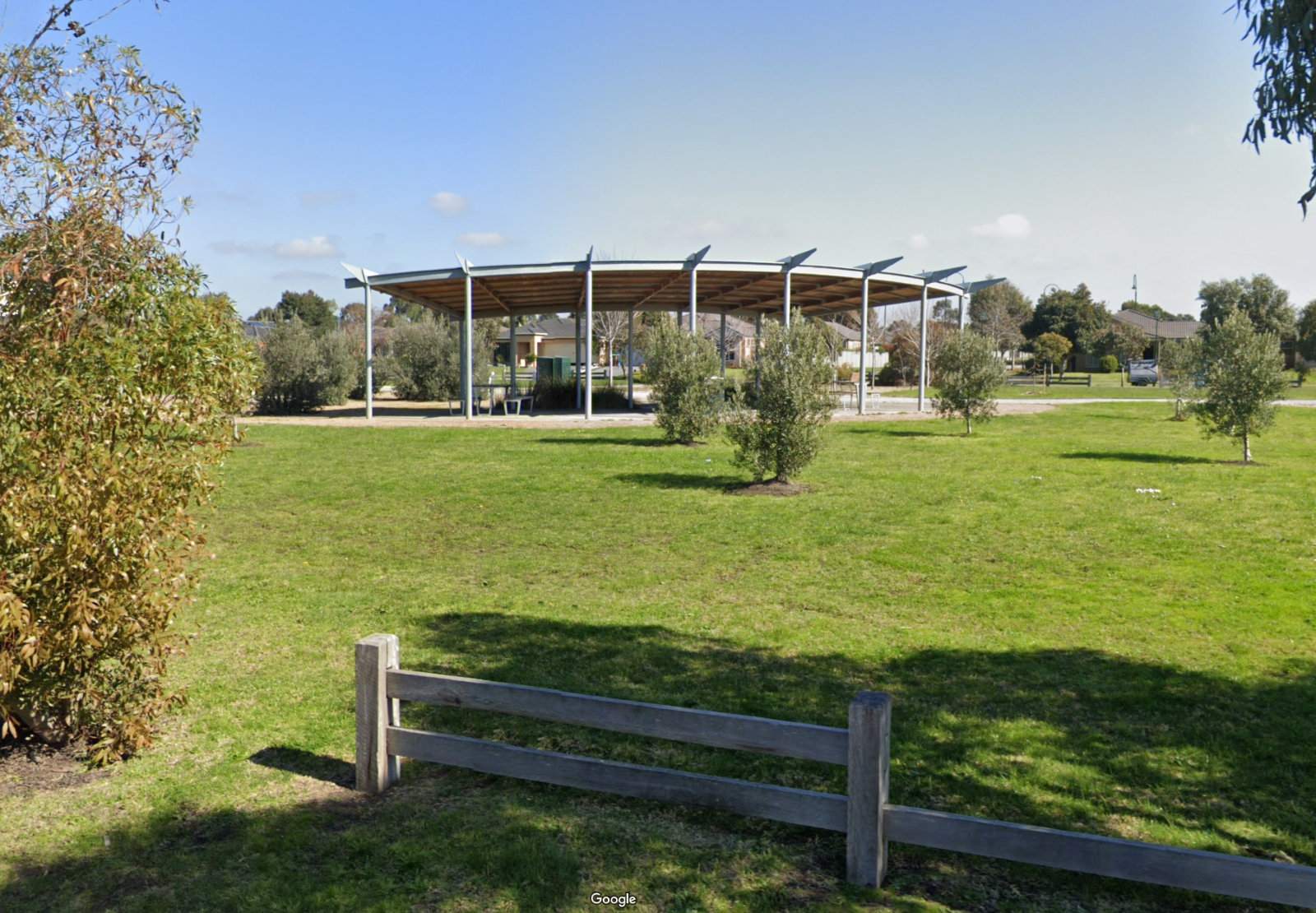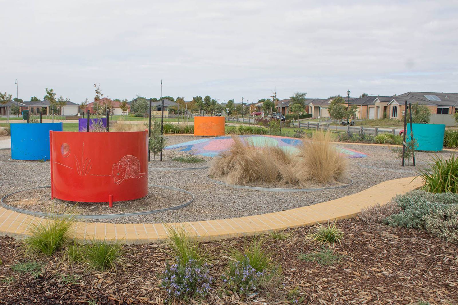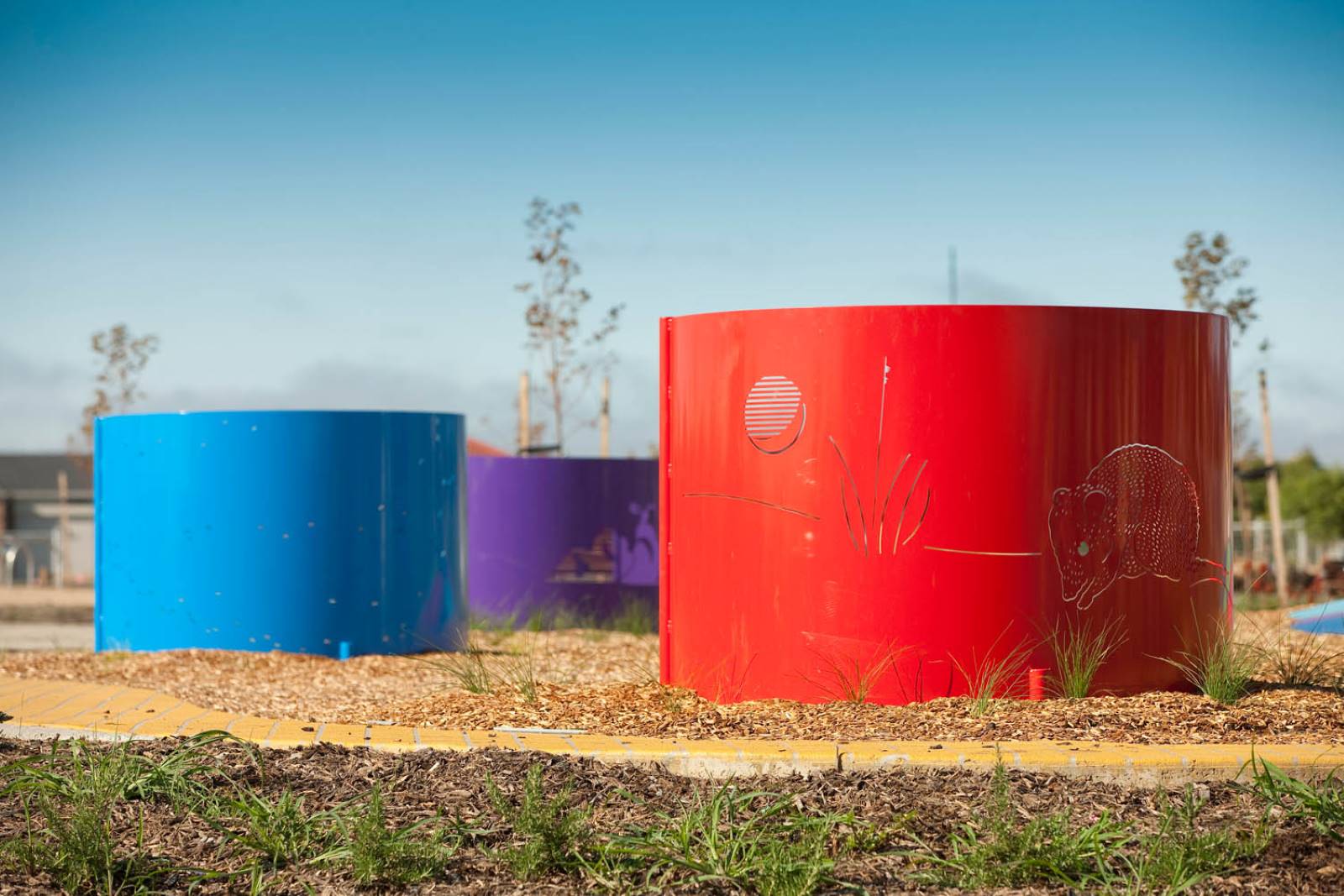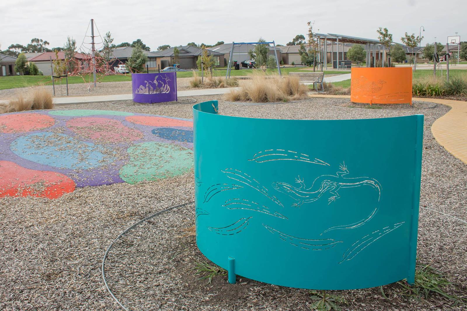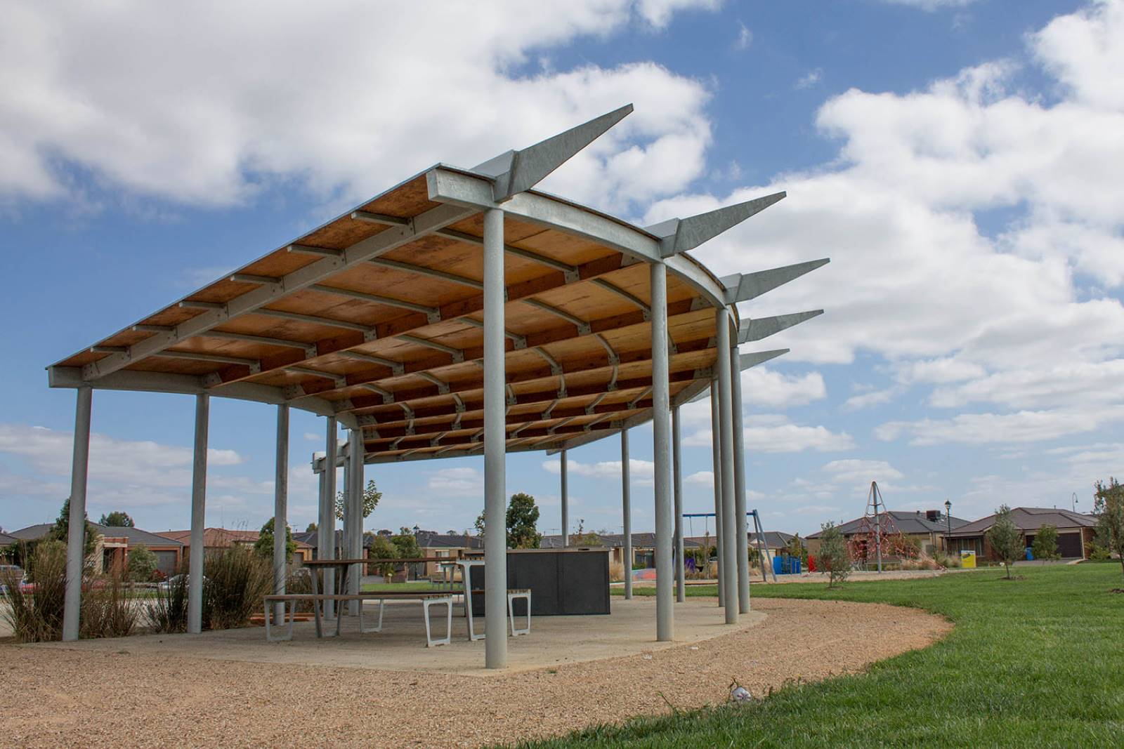 An arched shelter was used at Hunt Club estate. A galvanised frame highlight with steel fins and a plywood internal ceiling. Around the park, semi-circular colourful laser cut art panels were installed around the playground.
