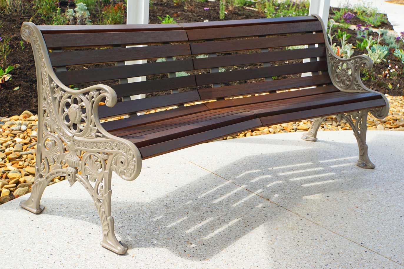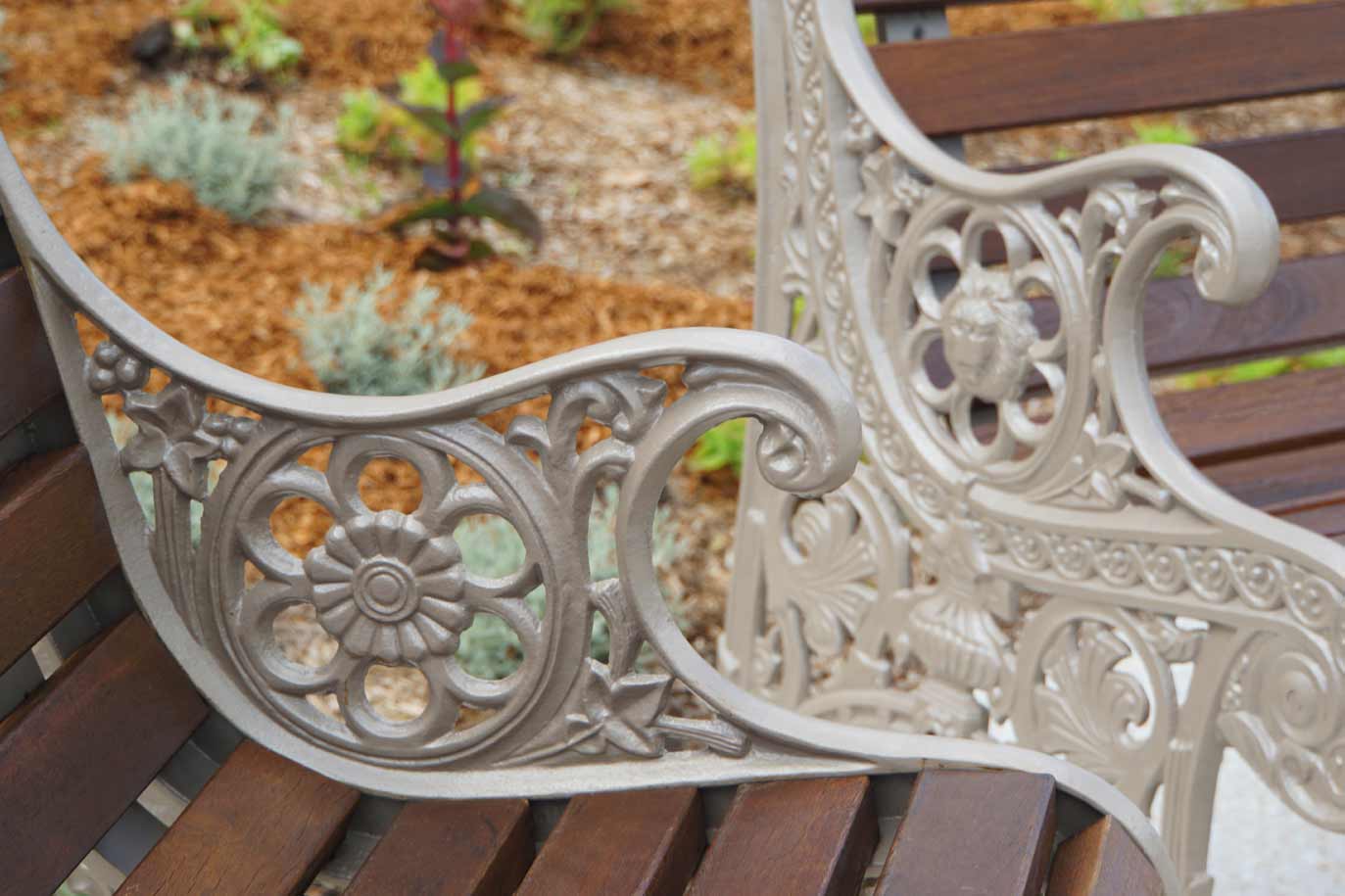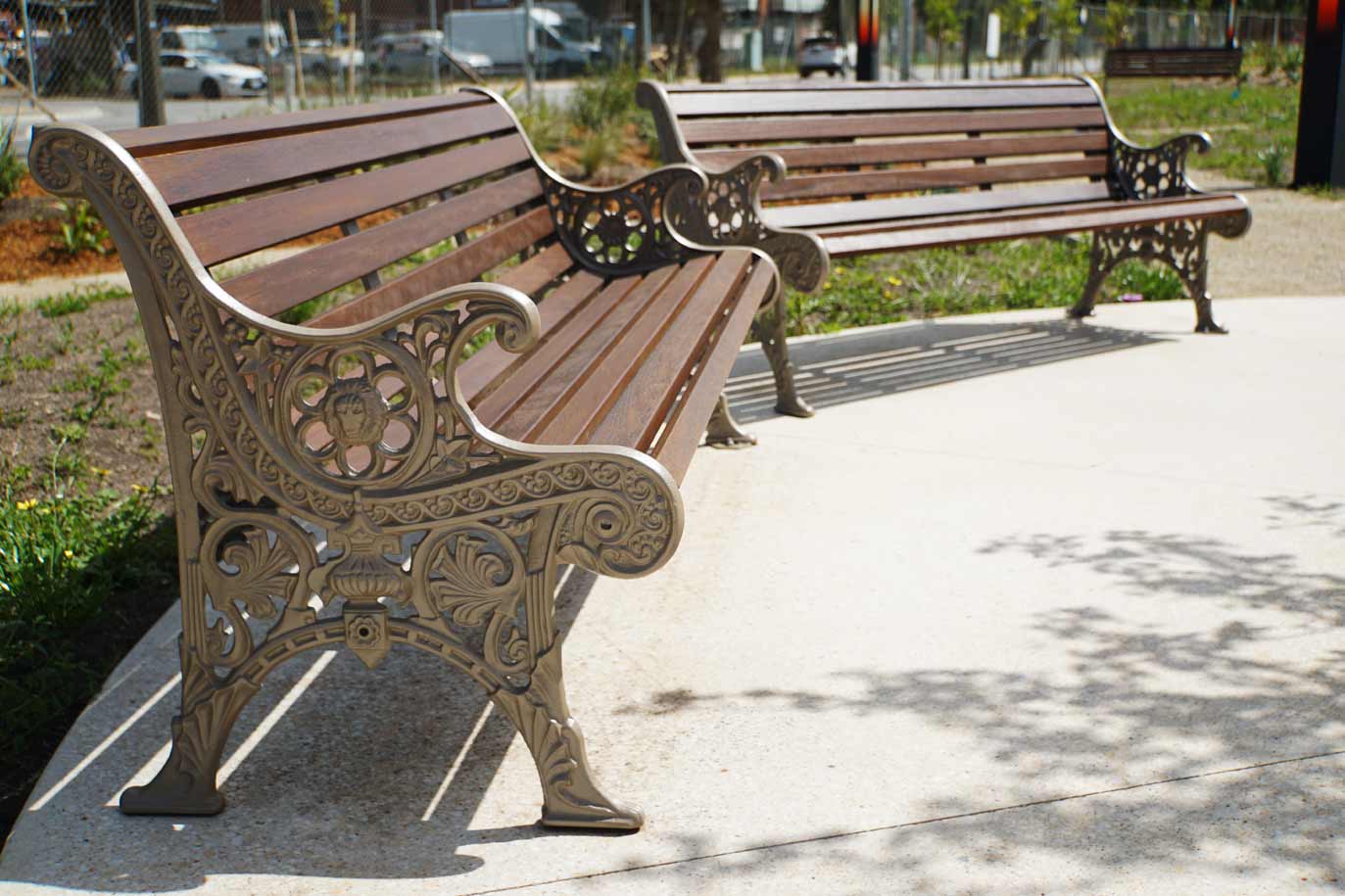 For the battens, we selected spotted gum hardwood, a durable Australian timber known for its strength and rich coloring, ensuring the refurbished furniture could endure outdoor conditions while offering a high-quality finish. Once assembled, the cast iron frame was finished with a fresh coat of Dulux Sensational Champagne powder coating, chosen for its elegant, subtle metallic sheen. This finish not only enhances the aesthetic appeal but also provides excellent weather resistance, protecting the structure from future corrosion. The blend of natural timber and metallic powder coating creates a striking visual contrast, making the refurbished furniture a functional yet artistic addition to the park.