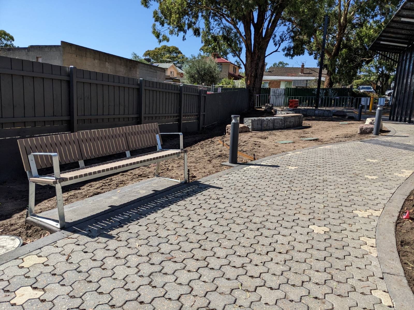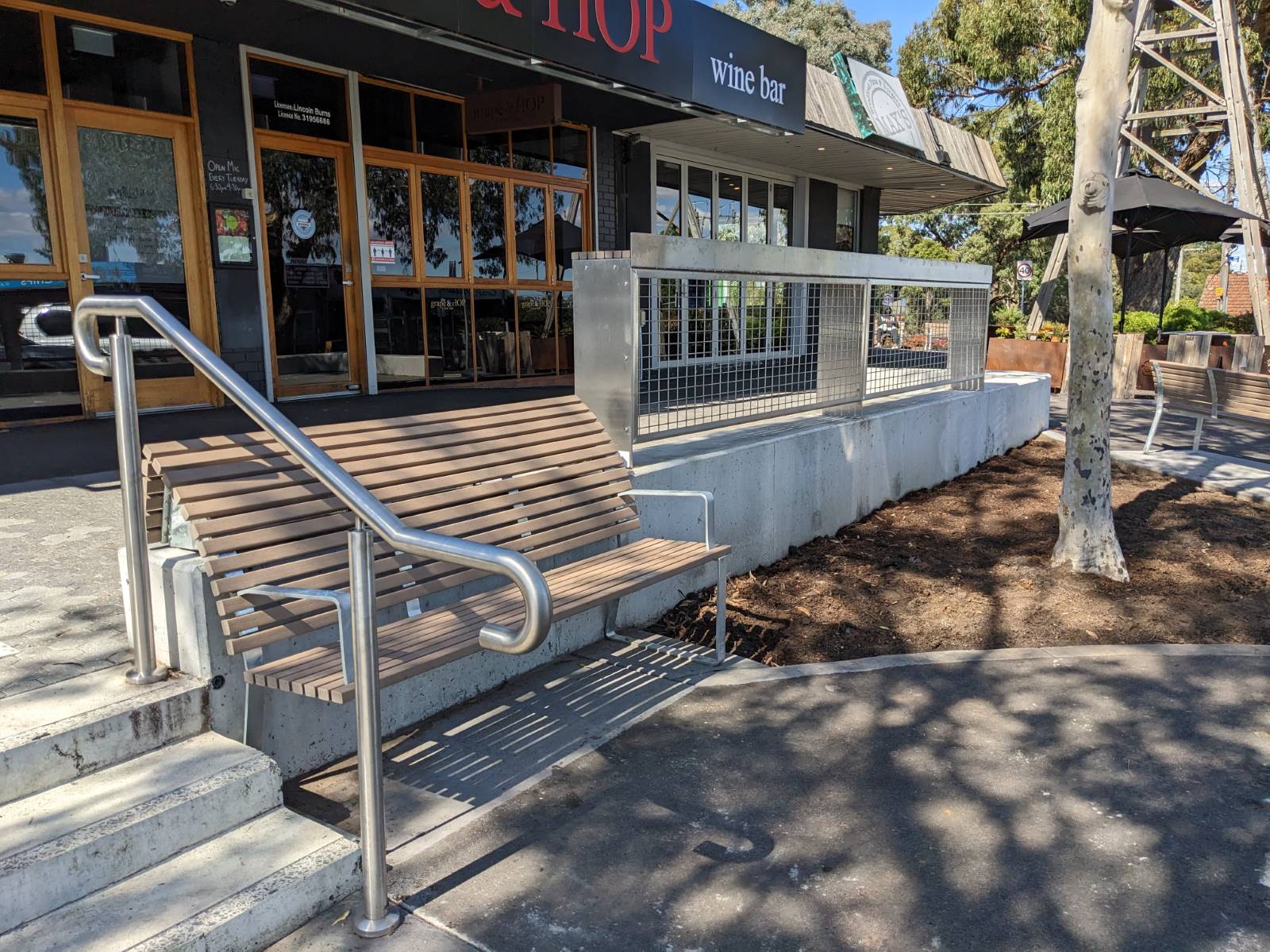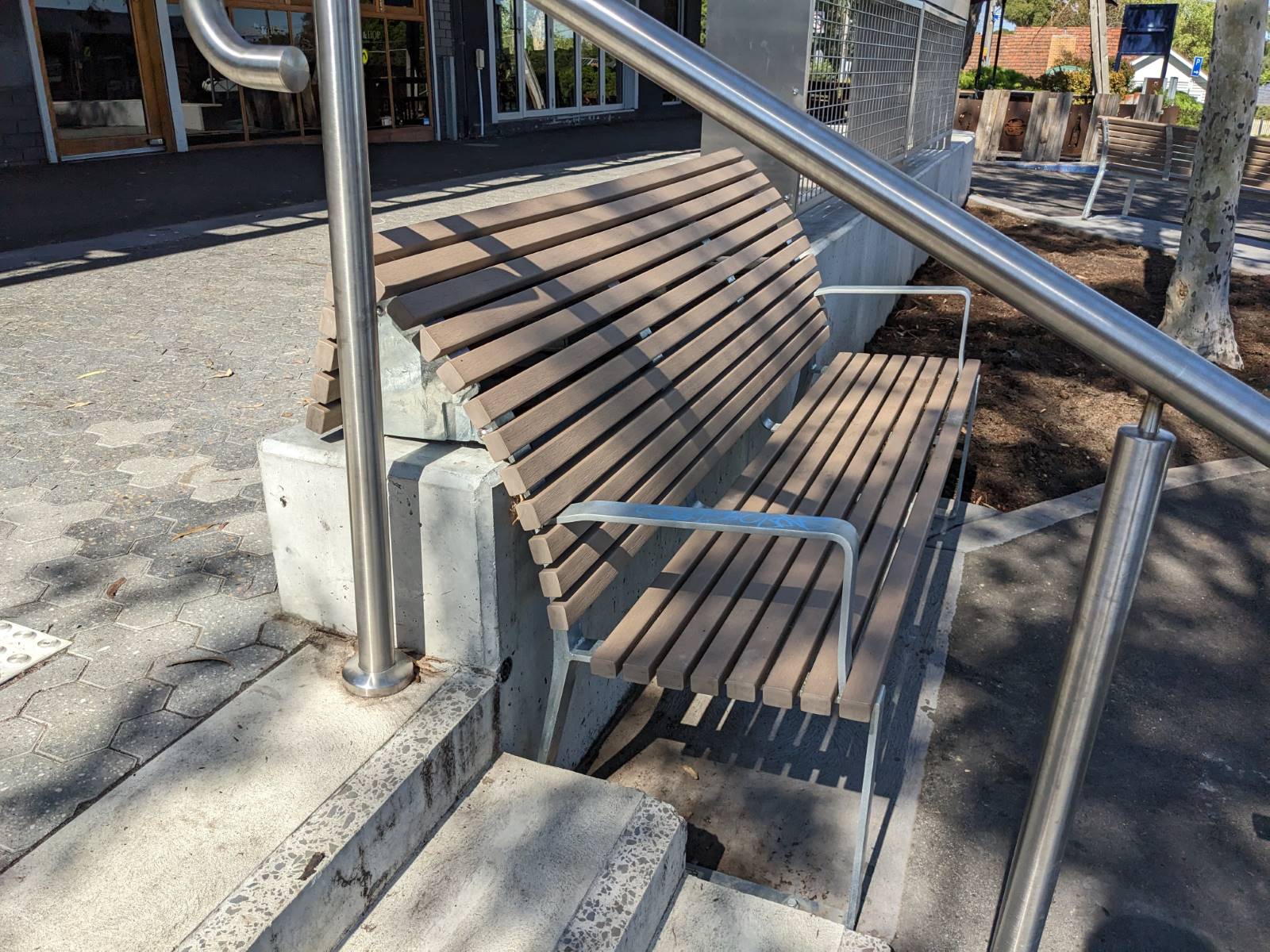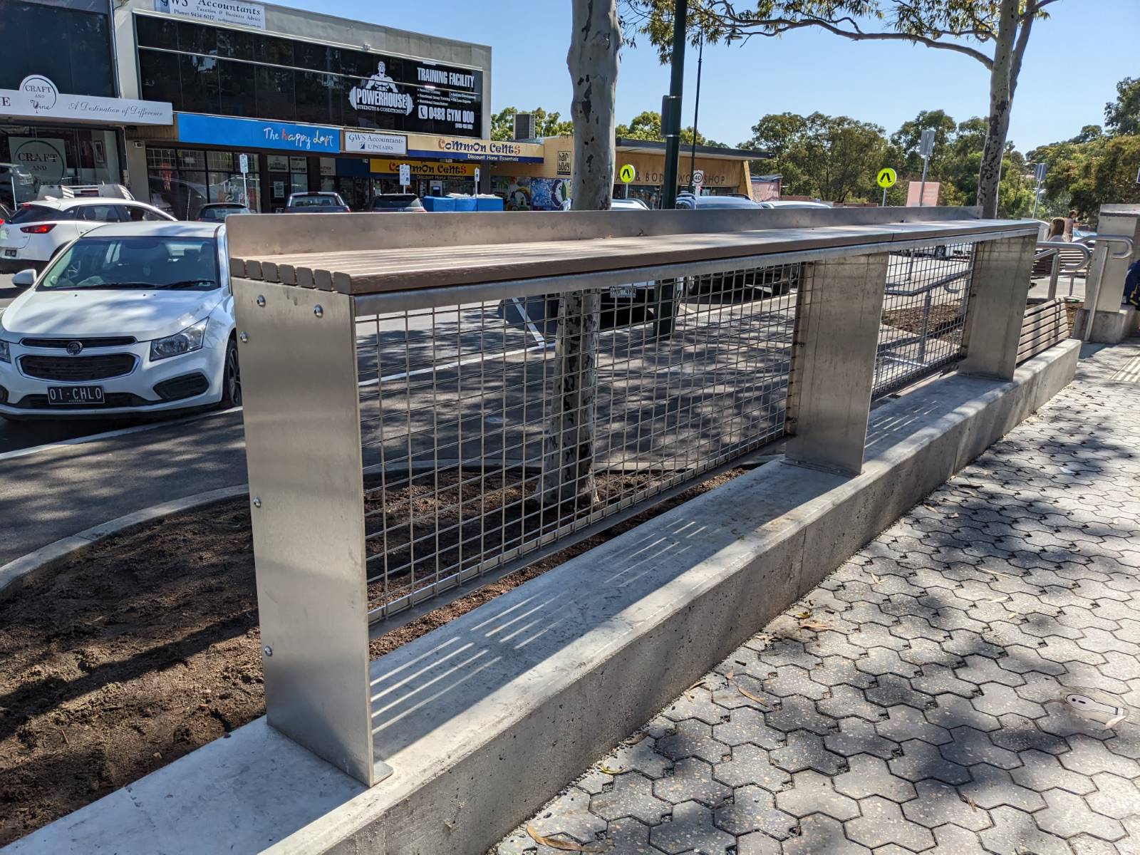 The feature of this product was the construction of a historical seat on a ramp using steel and timber elements that have been used in the area previously, The area also used CSA's Nepean Seat with custom Weathered Stone Enviroslat battens. Additionally there was a standing desk constructed from stainless steel to overlook the new streetscape.