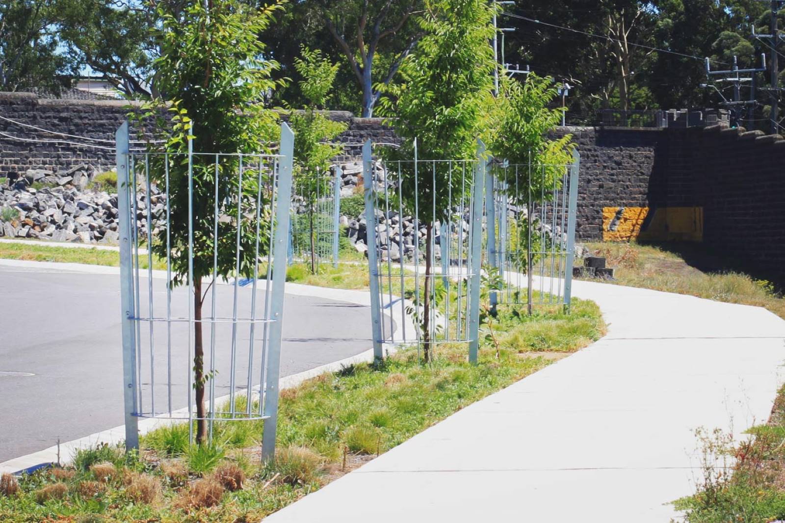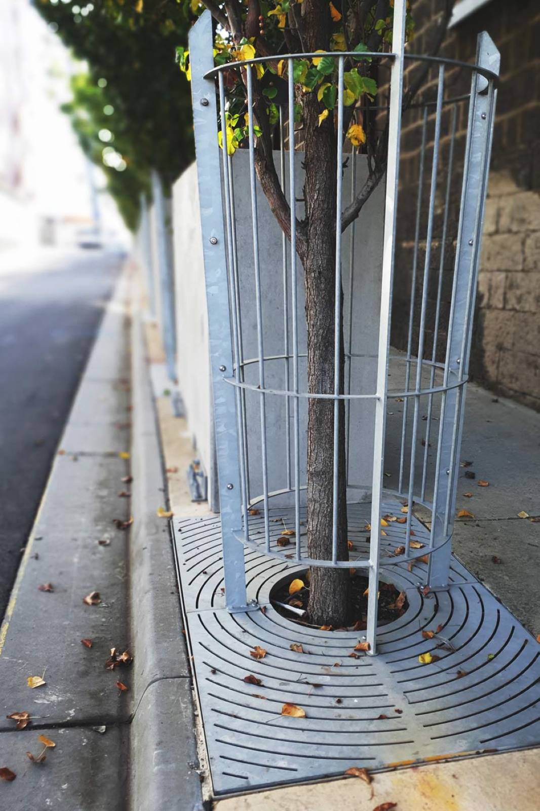 Seating within the piazza and tree guards and grates around the old prison buildings in the new pentridge estate.