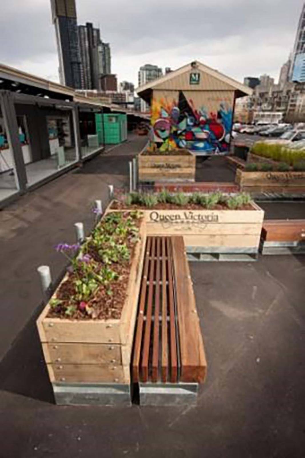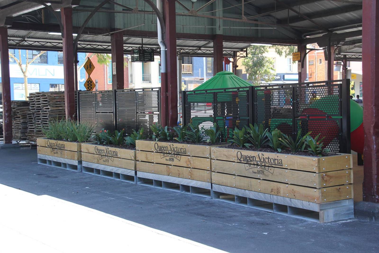 CSA were enlisted to help create two furniture elements for the rustic and heritage listed furniture elements. The first was a series of heavy timber benches made from galvanised mild steel and recycled Australian Spotted Gum battens. The second element was a group of tall planter boxes, also made from galvanised mild steel and treated pine timber battens. The QVM logo stenciled onto the face of the timber battens. All of these items designed to be moved around the market using the available forklifts.