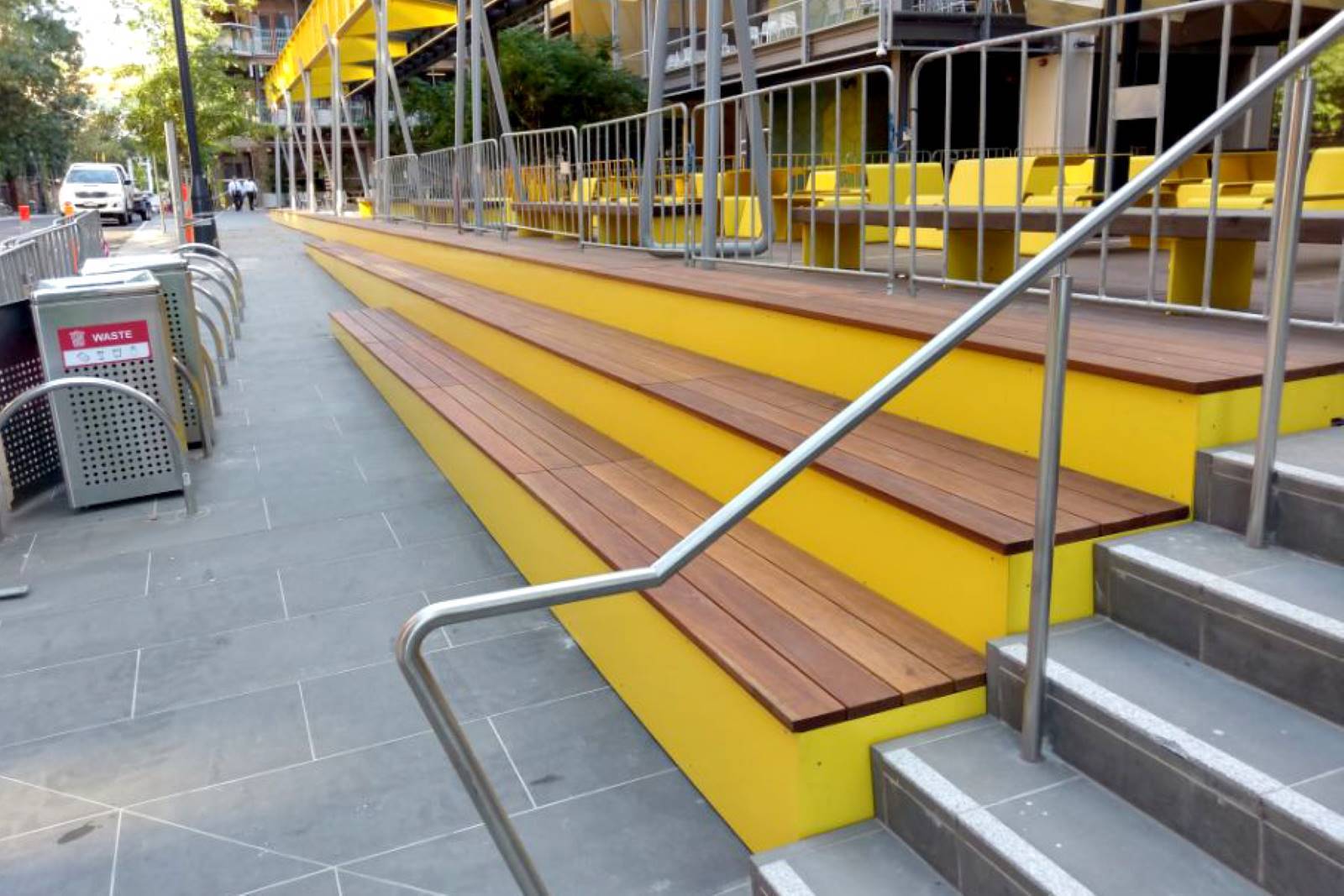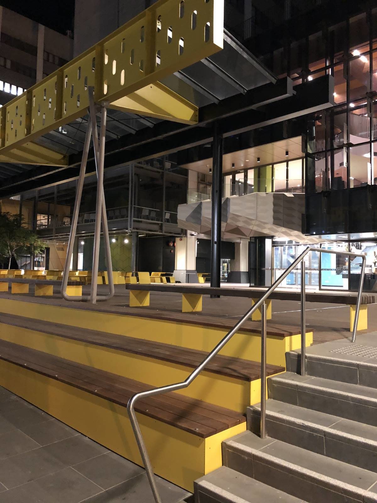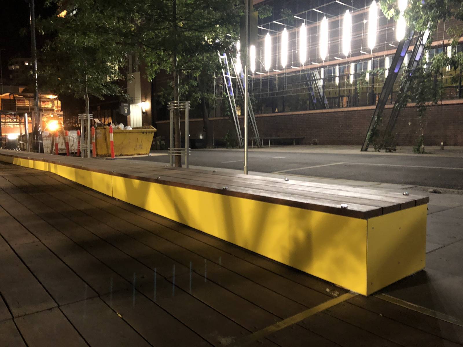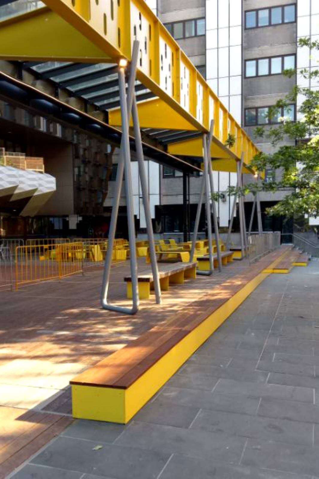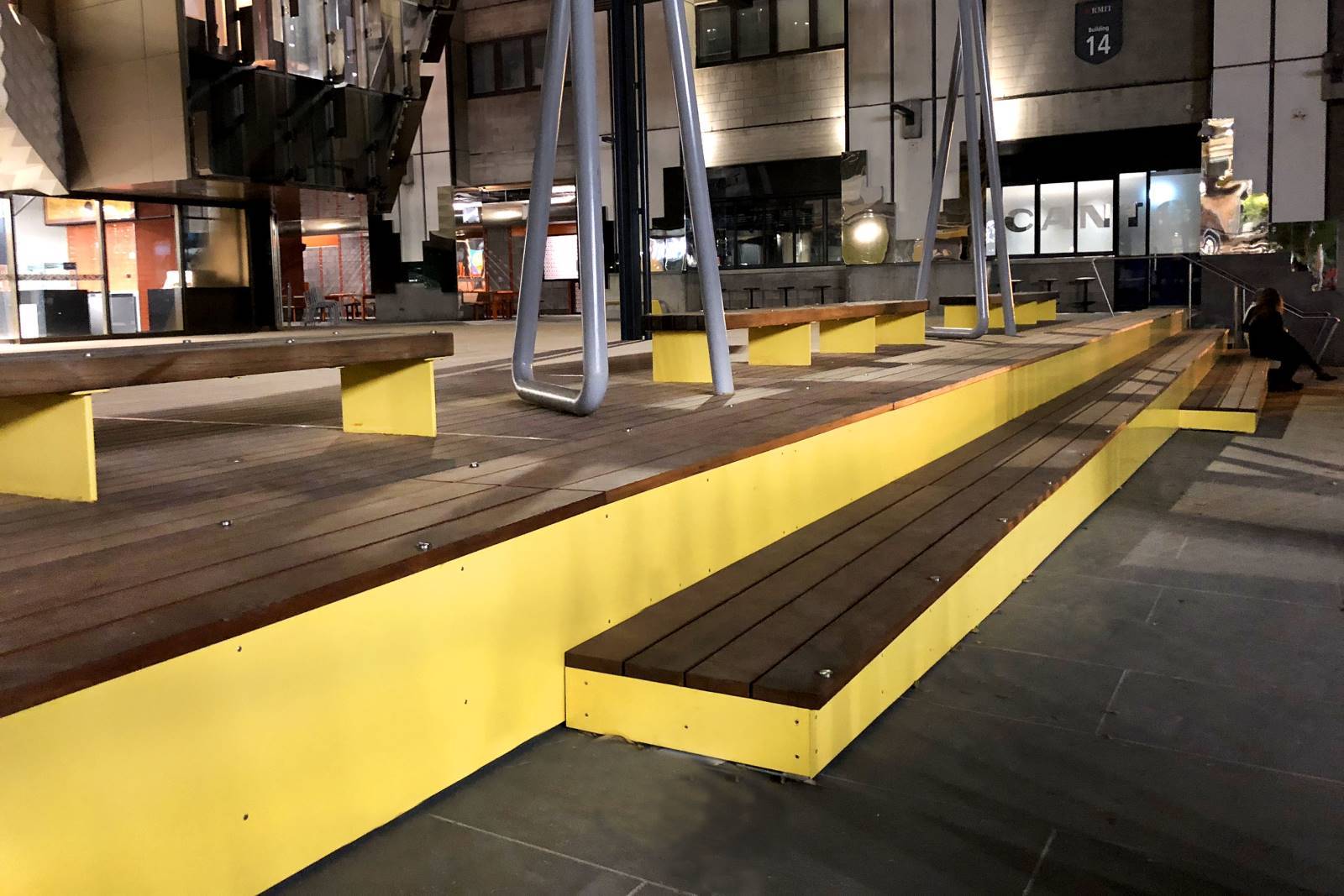 To help utilise the space of the side of the deck created for RMIT university and rather than finish the edge with balustrading, the university went with a tiered seating unit. The ground where this unit was installed followed a sloped down a hill so the area had to be mapped out and each leg of the terrace designed and cut to suit the site.